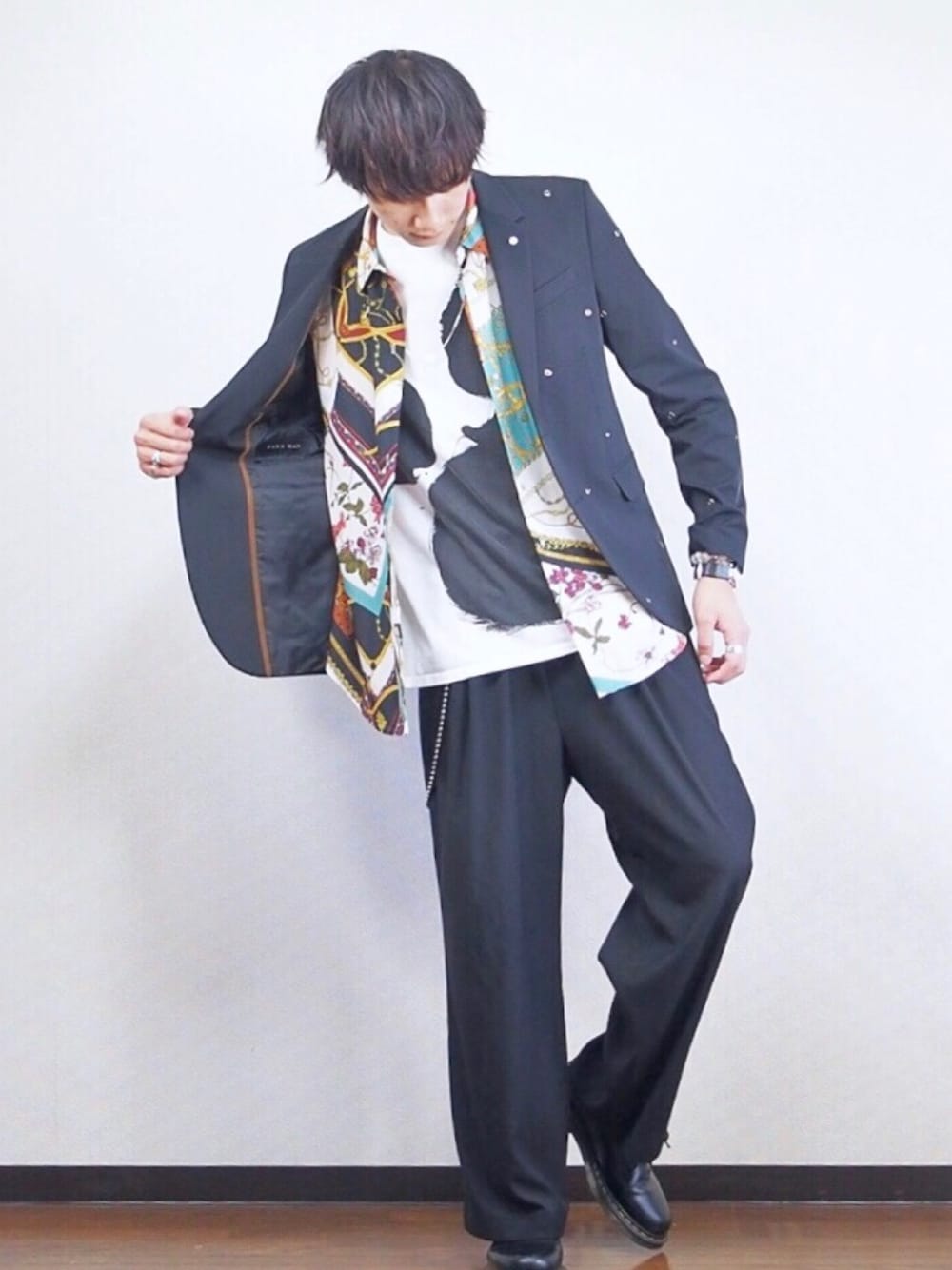 ご観覧ありがとうございます(^^) ジャケットに柄シャツを合わせたコーデ♪ こういう派手なの結構好き😋 よかったらいいね、お気に入り、フォローお願いします😁👋