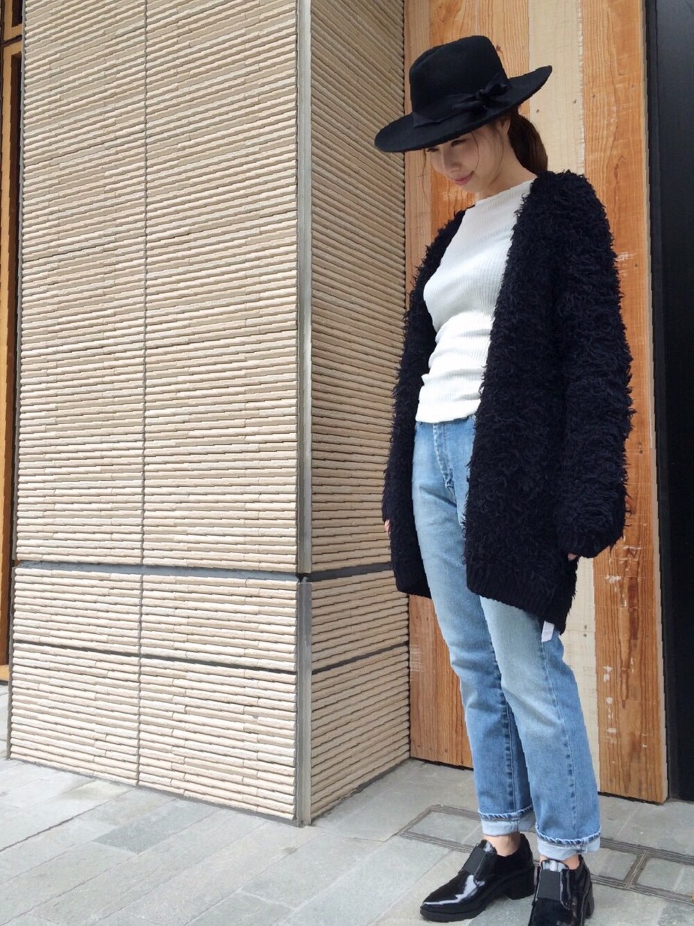 主役はもこもこカーディガン 他はシンプルに定番アイテムで。 このサロンオリジナルのデニムは、 履き心地抜群です。