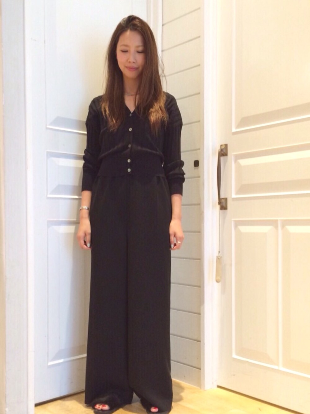 またまた黒と黒 前回のサロペットに、カーディガン重ねまして ワイドに、ショート丈っていうバランスが👌 退勤後に撮って髪がぼさぼさ。