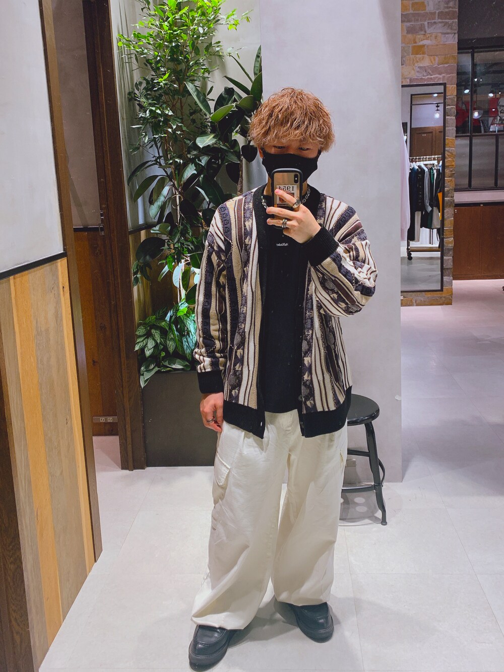 白黒のモノトーンにカーディガンを付けて大人っぽさをプラスしました! パンツは今年トレンドのカーゴパンツです! このカーディガンは柄がカッコよくてオススメです!