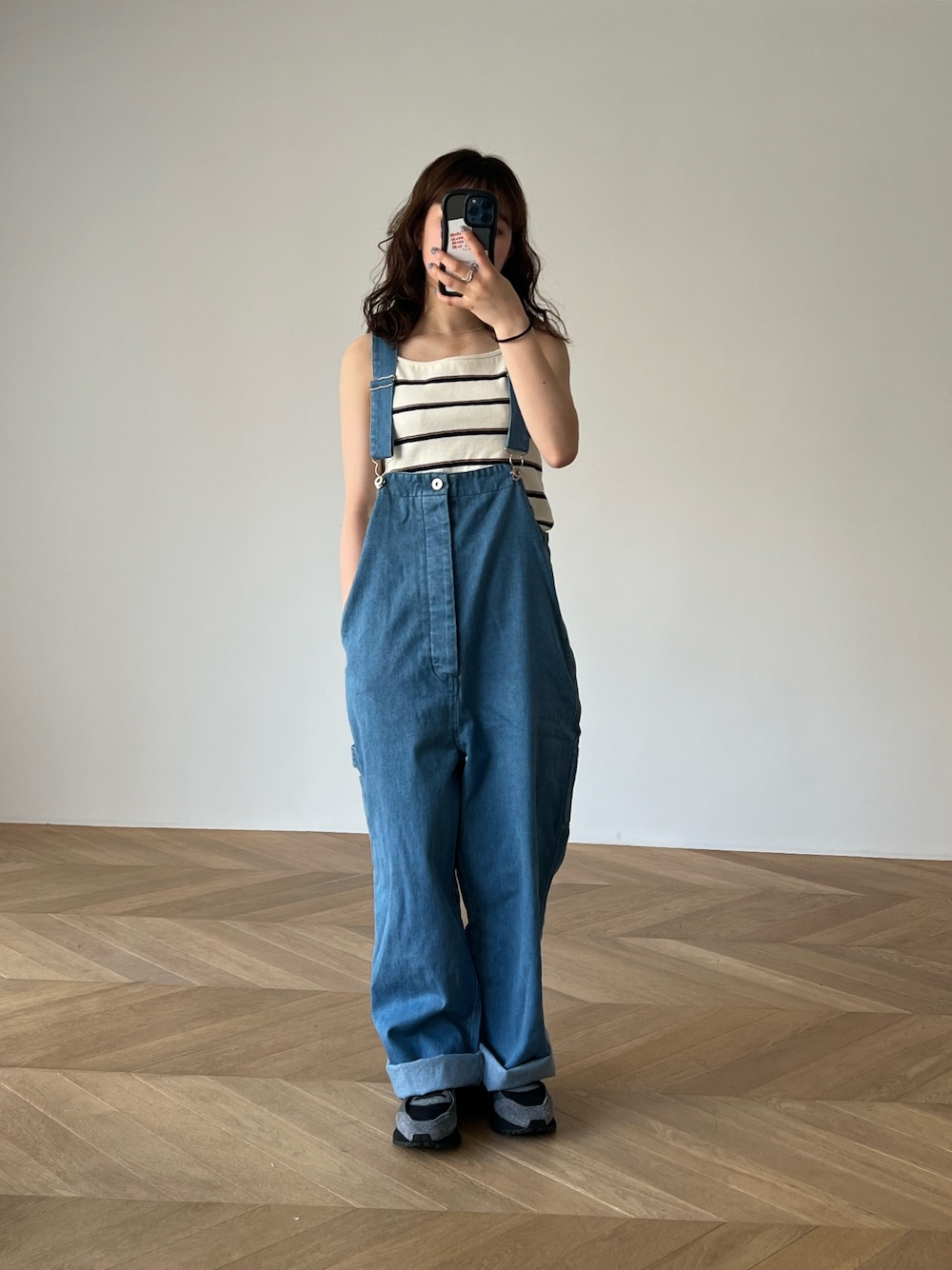 デコルテが綺麗に見えるシルエットのキャミにルーズなデニムサロペのバランスがかわいい♡ サロペットは2回折って履いています👖 このコーデでフェスとか行きたいな〜☀️