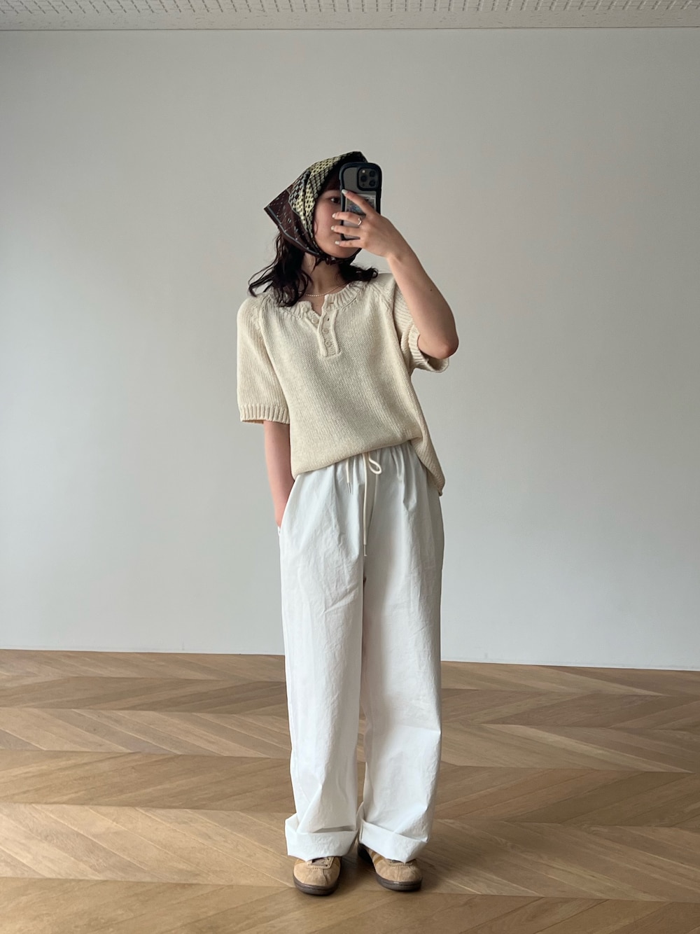 ホワイトのワントーンにバンダナでワンポイント👍🏼 夏のシンプルなコーデにポイントになるバンダナはカバンなどに着けてもかわいい♡