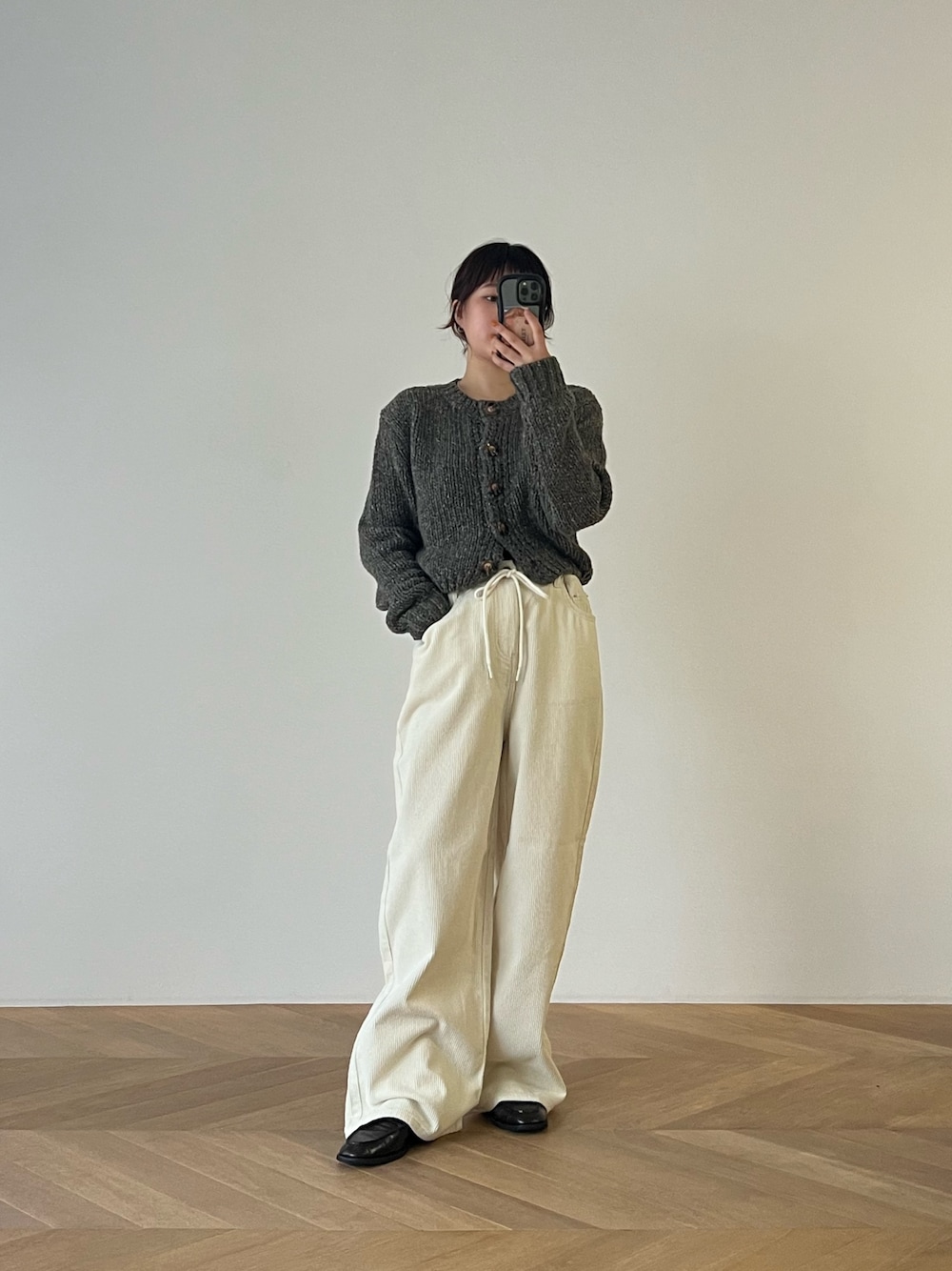 トップスはクロップド丈のカーディガンなのでバランスが取りやすく、ミックスカラーのニットなのが可愛い! コーデュロイパンツは緩さありつつ綺麗なシルエットなので着回し沢山できそう♪