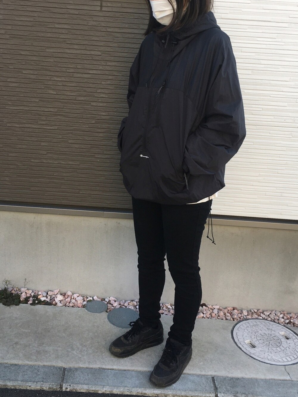 全身黒。 ここ数年ハマっているアノラックパーカー。