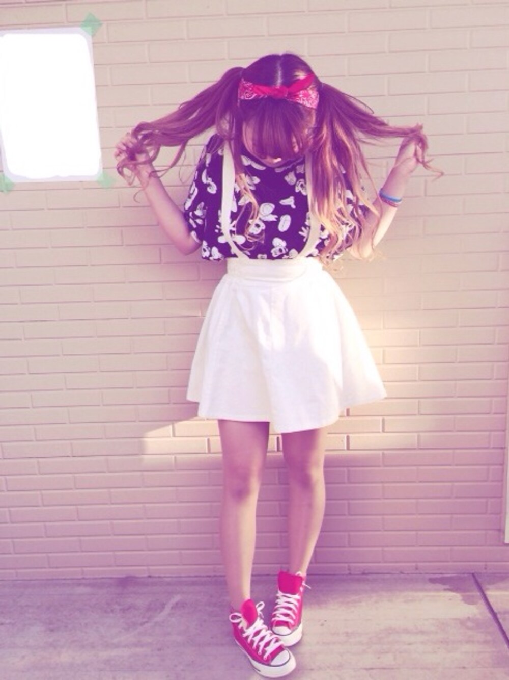 ブラック系のTシャツ/カットソー、ホワイト系のスカート、レッド系のスニーカーを着用したレディースの春コーディネートの1枚目の写真
