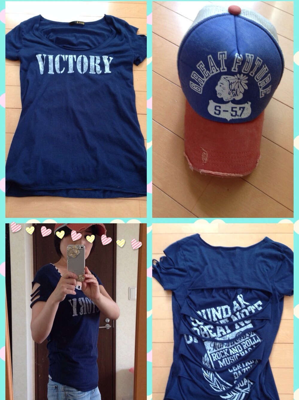 Design性のあるTシャツにデニムで合わせたコーデ(^_^) 背中に切れ目が入ってるので 中にボーダーのキャミがチラチラ見えて ボーイッシュの中にも女の子っぽく着れる一枚です♪