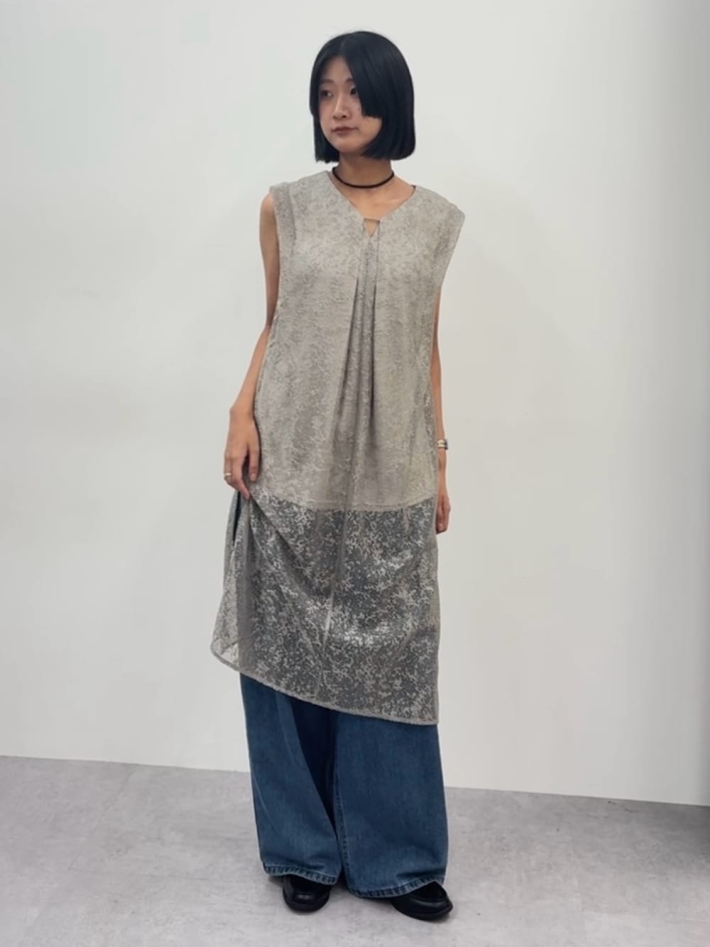 Callarusのパンツドレスを使って カジュアルコーデを組んでみました🪞 光沢感あるの上品なライトニングレースのドレスを主役に、ワイドデニムでラフに着崩した抜け感コーデ✨ ロング丈×ボリュームボトムのバランスが今っぽく、シンプルながらも存在感のあるスタイリングに仕上がります🤲🏻