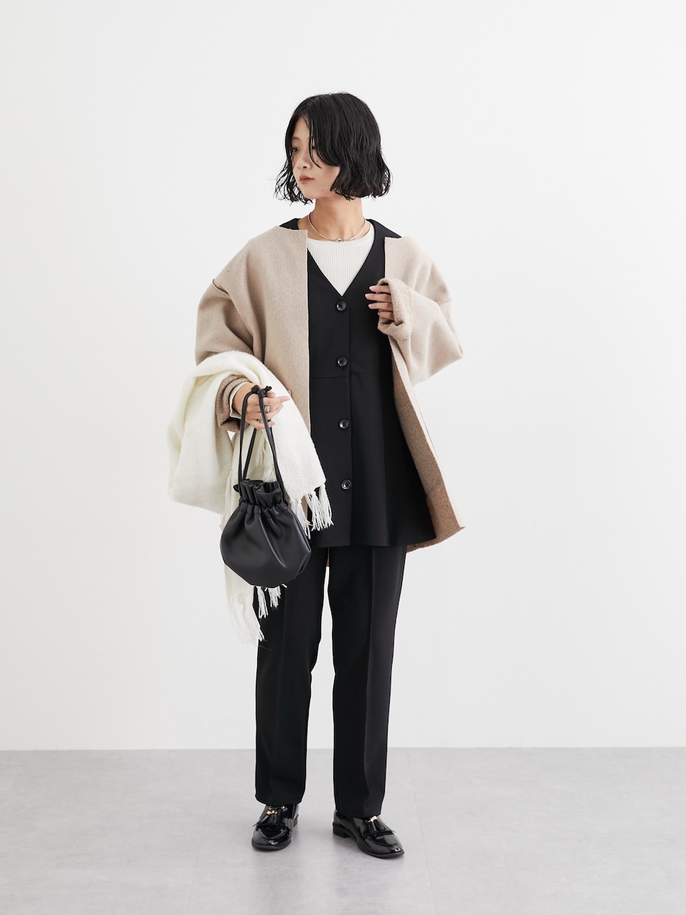 Mao(nissen)のスーツセット「ジレセットアップ(ペプラムジレ+パンツ)」を使ったコーディネート