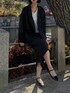 【トップス】 ・ジャケットは、肩を落とした程よいオーバーサイズ感がこなれた印象を作ります。 ・お尻が隠れる長めの丈感なので、気になる腰まわりもしっかりカバーできました。 ・袖丈は少し長めですが、あえてラフに羽織ることで手首に抜け感が生まれます。 ・インナーにはVネックを合わせ、デコルテをスッキリ見せて顔まわりを明るくしました。 【ボトムス】 ・スカートは、広がりすぎないタイトめなシルエットが縦のラインを強調してくれます。 ・ふくらはぎが隠れる絶妙な丈感で、足首が一番細く見えるバランスにこだわりました。 ・ウエスト周りはスッキリしているので、ジャケットを羽織っても着膨れせず安心です。 ・落ち感のある素材が肌に馴染み、長時間の着用でもシワが気になりにくいのが嬉しいポイント。 【シューズ・バッグ・小物】 ・足元はストラップ付きのパンプスを合わせ、辛口な黒コーデに程よい甘さを添えました。 ・甲が見えるデザインを選ぶことで、重たくなりがちなオールブラックに軽さを出しています。 ・バッグは小ぶりなものを持ち、重心を下げすぎないようバランスを整えました。 【スタッフのつぶやき】 ・「カチッとしすぎたくないけど、品良く見せたい」という日にぴったりのセットアップです。