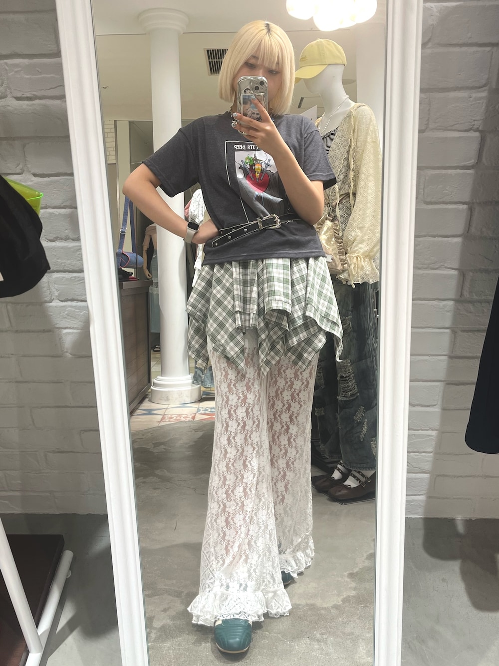 tops:少しタイトめなシルエットのtシャツは着丈も長すぎないのでアウトした状態でもバランス良く見えます。 skirt:1枚で履いても可愛いレイヤードスカート。ボリューム感を抑えたい時は上からトップス重ねるとバランス良く見えます。 pants:レイヤードレースパンツは、あえてギリギリの長さで履くことでより脚が長く細見えします!とっても涼しくて夏でも快適です。