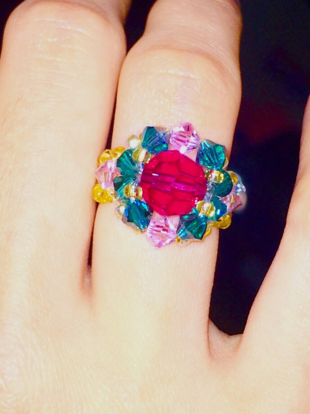 大好きなお婆ちゃんが作ってくれたビーズリング💍 ぱっと見、すごいキラキラしててビーズじゃないみたい!色合いも可愛くて、お婆ちゃん尊敬!