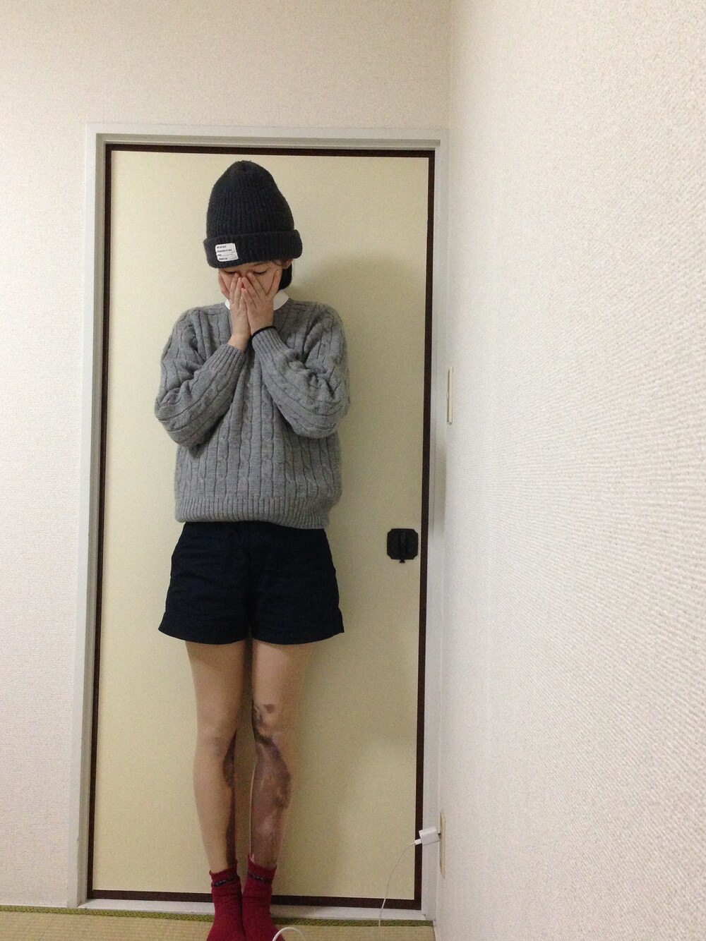 焼肉食べ行く日 ニット帽/ SHIPS JET BLUE シャツ/fig London ニット/used パンツ/無印良品 タイツ/アバンギャルド