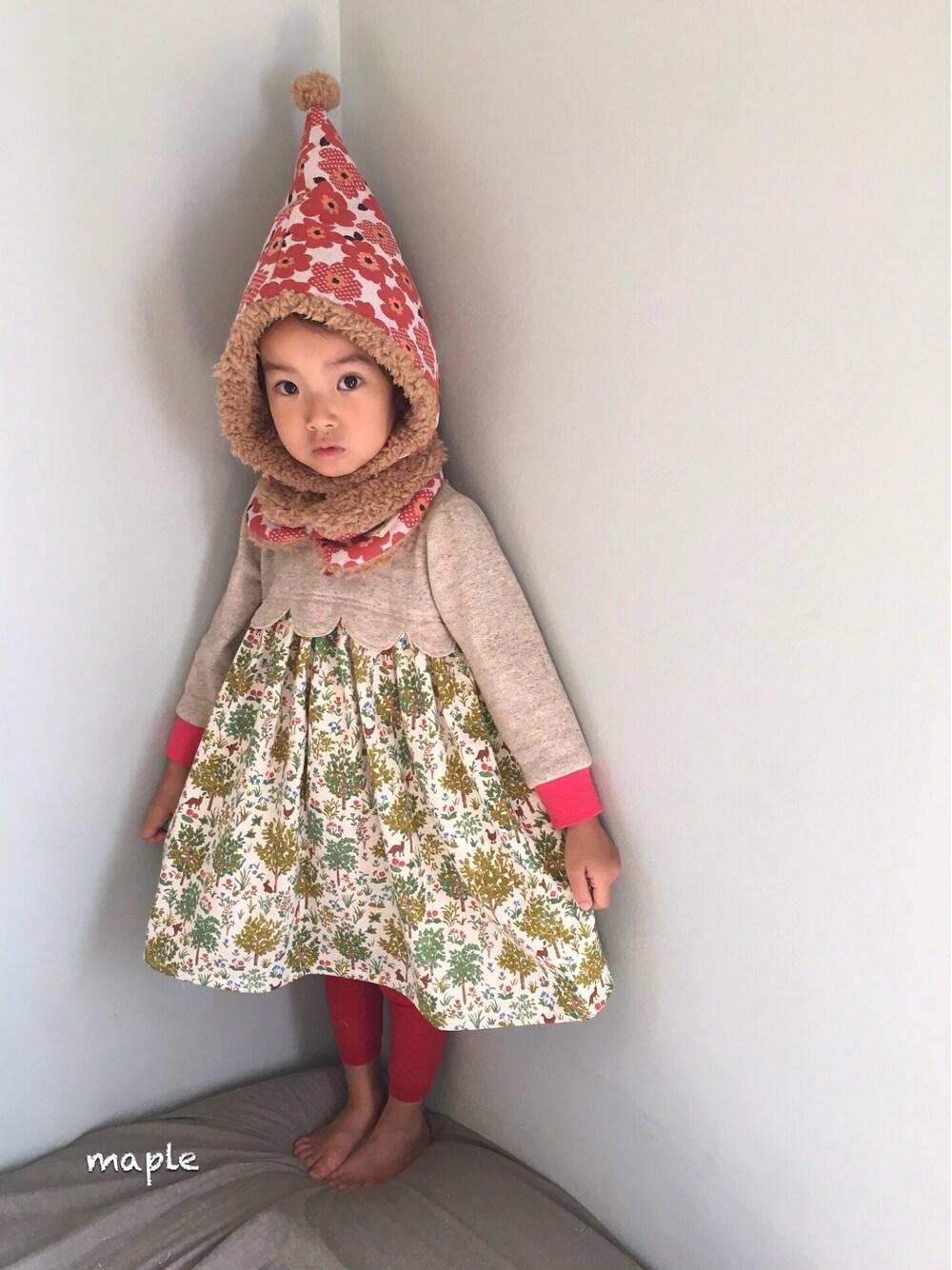 小人フードM ティペットえりまきM スカラップワンピ100 ハンドメイドのお洋服です♪ 森な雰囲気で合わせてみました。