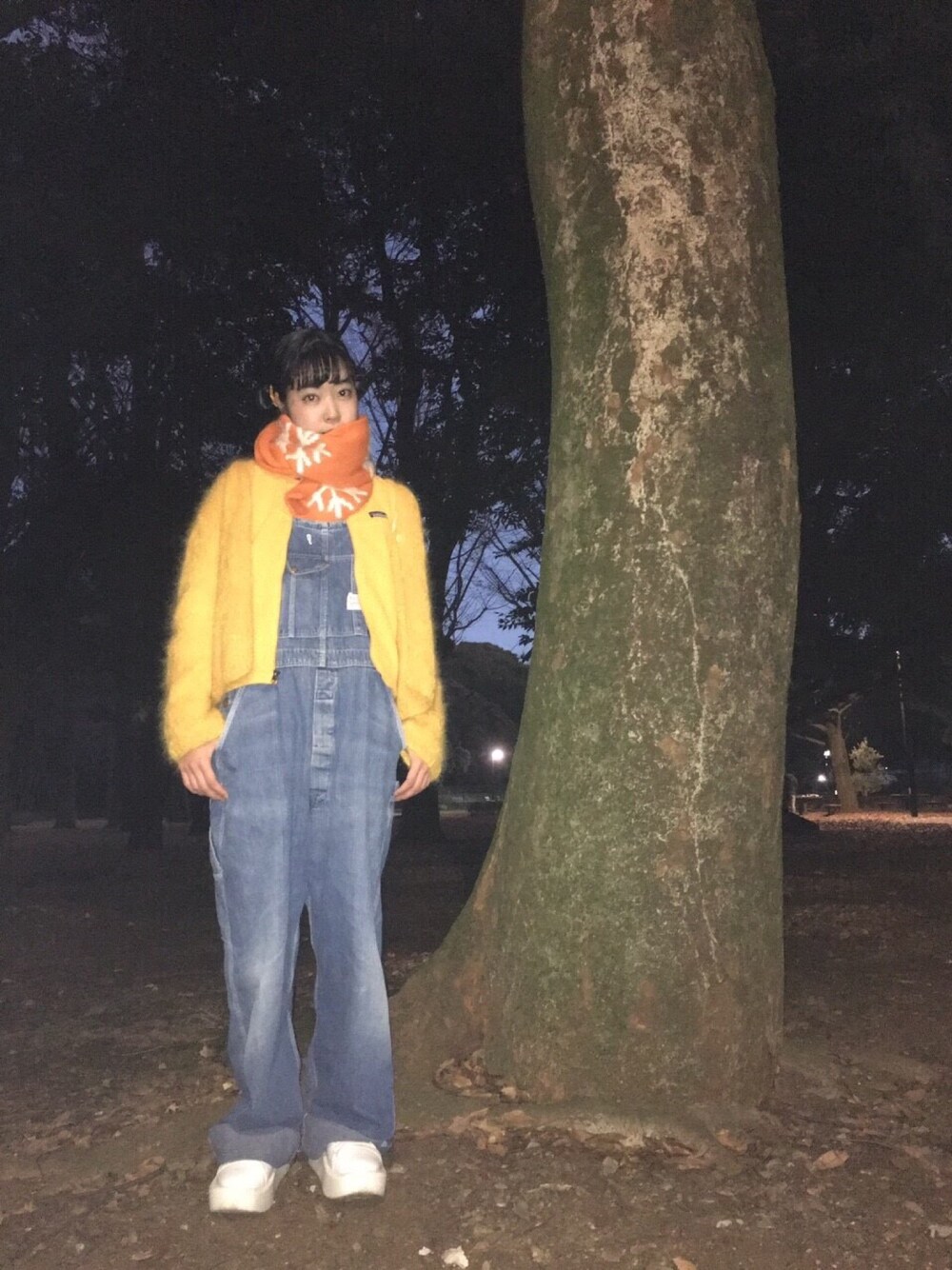 ホワイト系のスニーカー、オレンジ系のマフラーを着用したレディースの冬コーディネートの1枚目の写真
