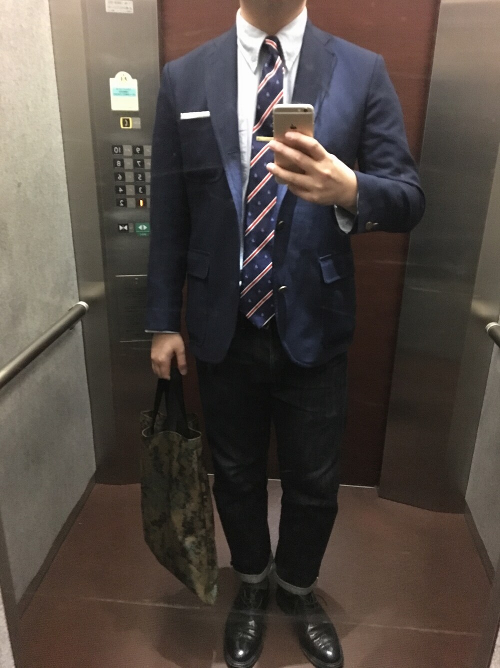 こてこてのアイビーを狙ったつもり。 このブレザーは青み強め、丈短めなので、やはり正統な紺ブレ一着欲しいところ。