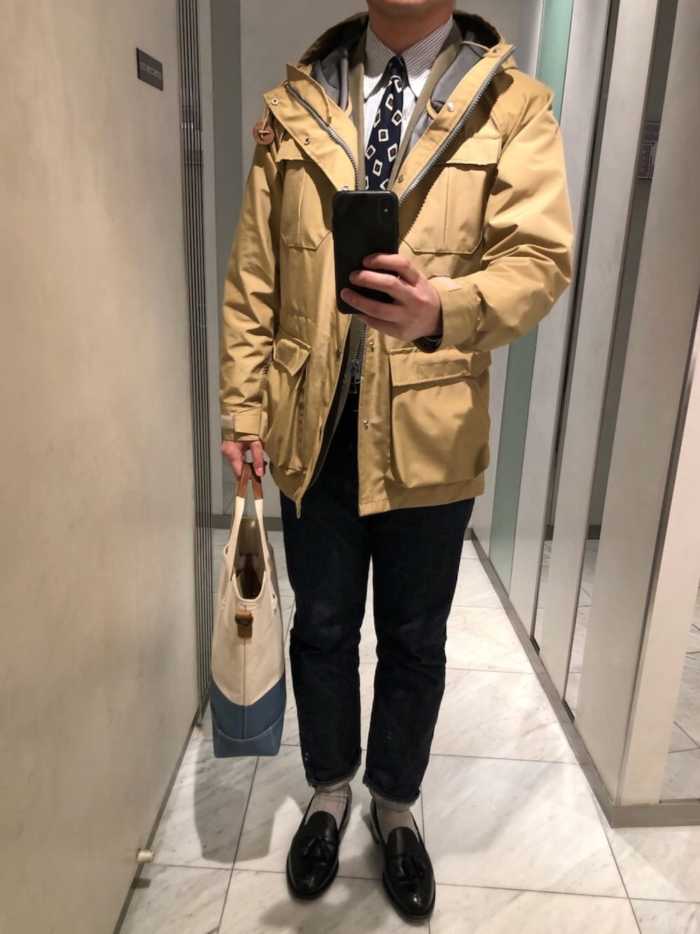 前回のコーデにジャケットとネクタイを挟みました。 コテコテアイビー感が増して良い感じです。