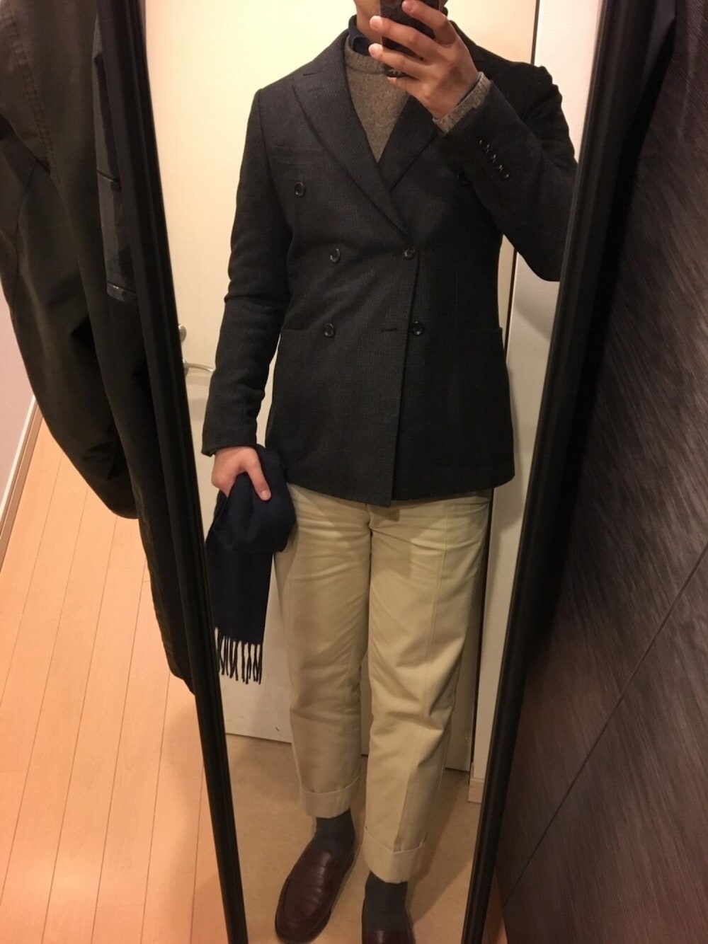 ダブルのジャケットで、ブラウングラデーション。イメージは、小窓のアンドレアさん。 もはや、アメトラどこ行ったといった感じですね。 このジャケット、手持ちのどのジャケットよりも着心地が良く、軽いショックを受けています。 少しずつ、ジャケットの入れ替えを図っていきたくなっています。 そして、もう1つポイントは、無印のニット。無印はいつも着ないものにチャレンジする時に使いますが 安い服を安く見せないコツは、普段から周りの人達より良いものを着る事です(笑)