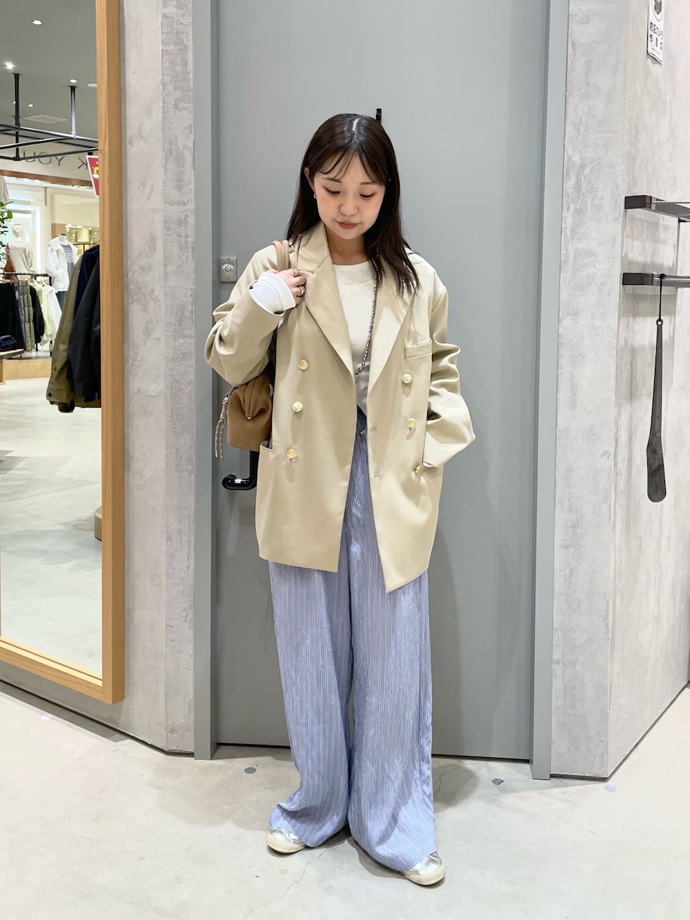 ▫︎GEVACOダブルブレスジャケット 着用:S オーバーサイズのダブルジャケット。 高級感のある素材で、春秋の肌寒い時期の羽織としても万能です。 ▫︎shay カップ付フロントスリットトップス おへその位置からスリットが入ったヘルシー見えトップス。 カップ付きで一枚で着れるので楽チンです。 ▫︎GHアソートストライプ柄パンツ 着用:S ゆるっと着られるイージーパンツ。 ウエストもかなりゆとりがあるのでストレスフリーに着ていただけます。 薄手のレーヨン素材で、汗ばむ夏も涼しく快適に過ごせます。