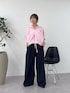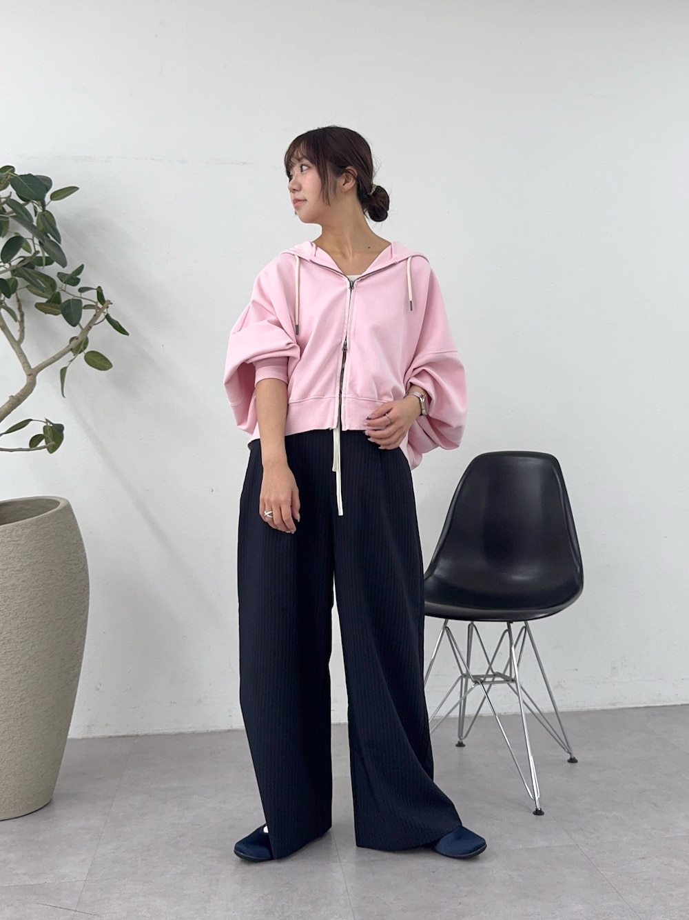 ピンクのパーカーが目を引くリラックスコーデ🩷 パーカーにはスラックスを合わせてカジュアルになりすぎないように。 バレエスニーカーでトレンド要素も取り入れました!