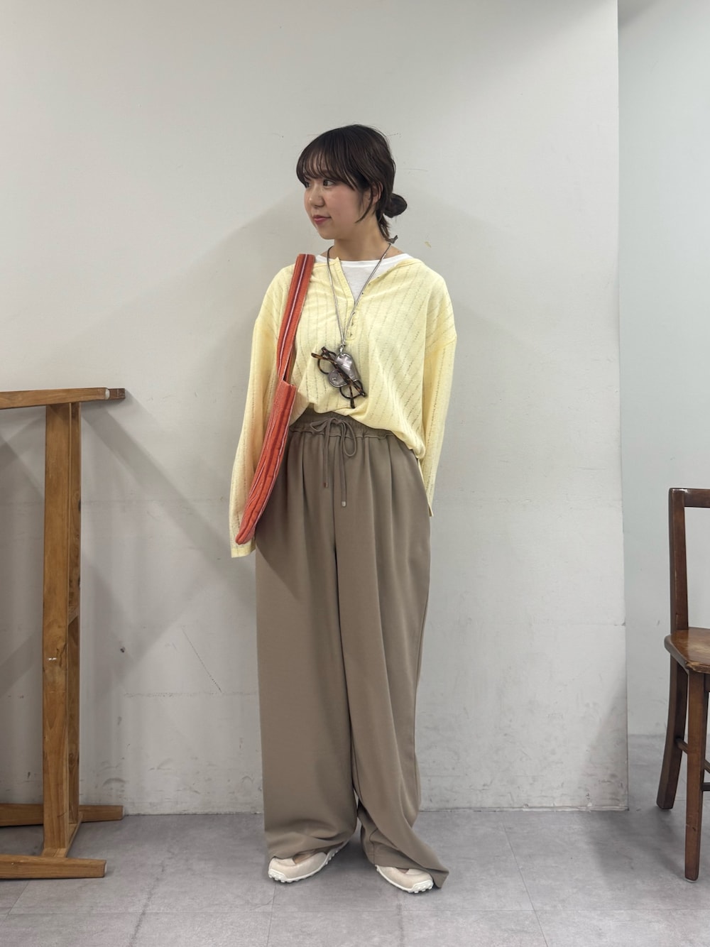 春らしいイエローのシアートップスは、ホックデザインで着るだけでおしゃれ見え◎ ジャージのような着心地の、万能スラックスできちんと感もプラス!