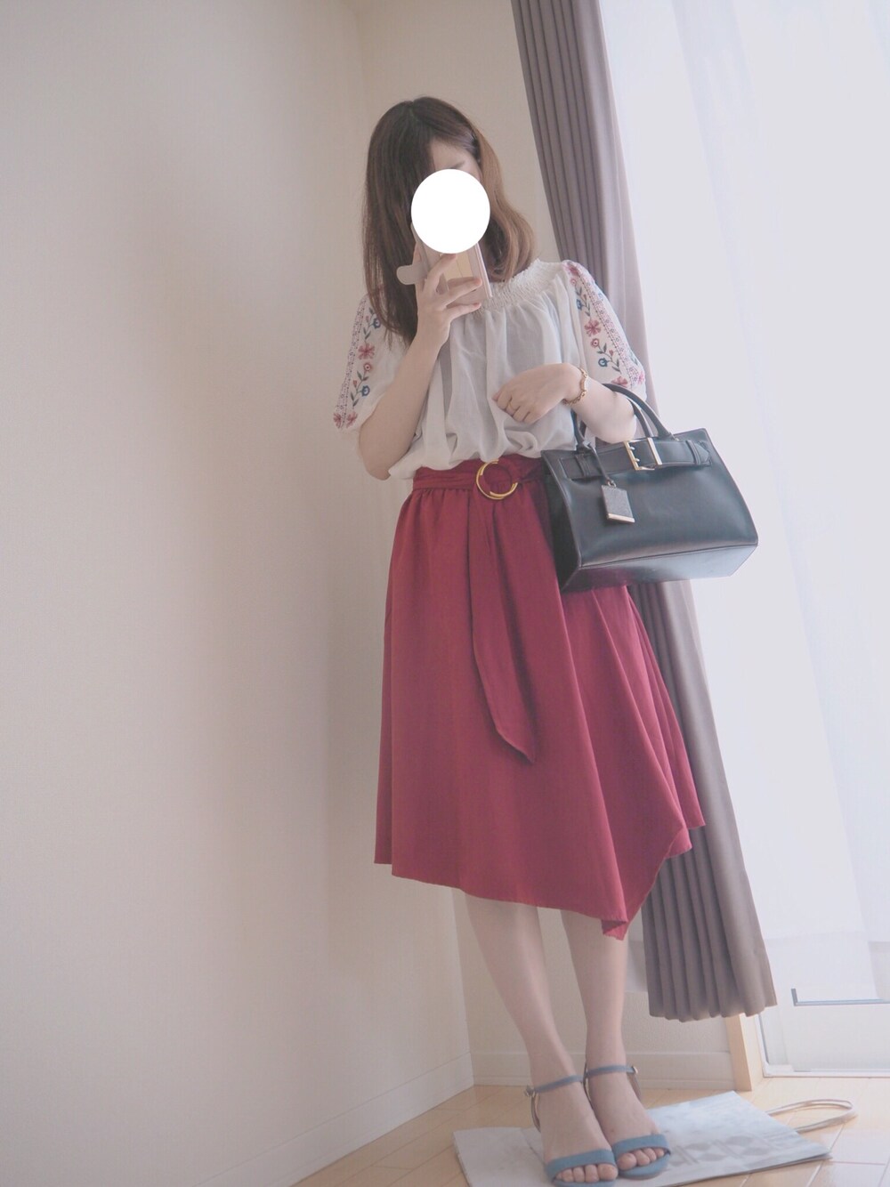 オフショル×アシメスカート 久々スカート履いて テンション上がっている🙈 ベルトかわいい パンプスは低めヒール😉