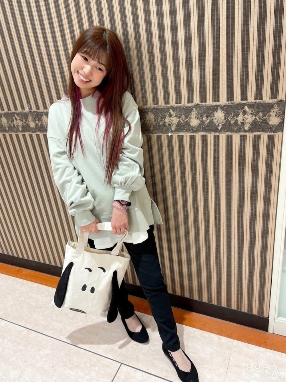 今日は大人気!USAコットンのスウェット✖スキニーパンツ コーデです😚 . . スウェットはボリューム袖で今っぽ感を★ . . ゆったりと着れて、裾脇にスリットが入っているので重ね着でインナーをチラ見せが◎☝️ . . スキニーパンツはピッタリしすぎないので履き心地抜群!!動きやすく、お出かけやおうち時間も快適に過ごせますよ〜 . . ポイントは、、垂れた長い耳のスヌーピーのバッグ★ . . シンプルなスタイルに合わせたら かわいさUP間違いなし!!