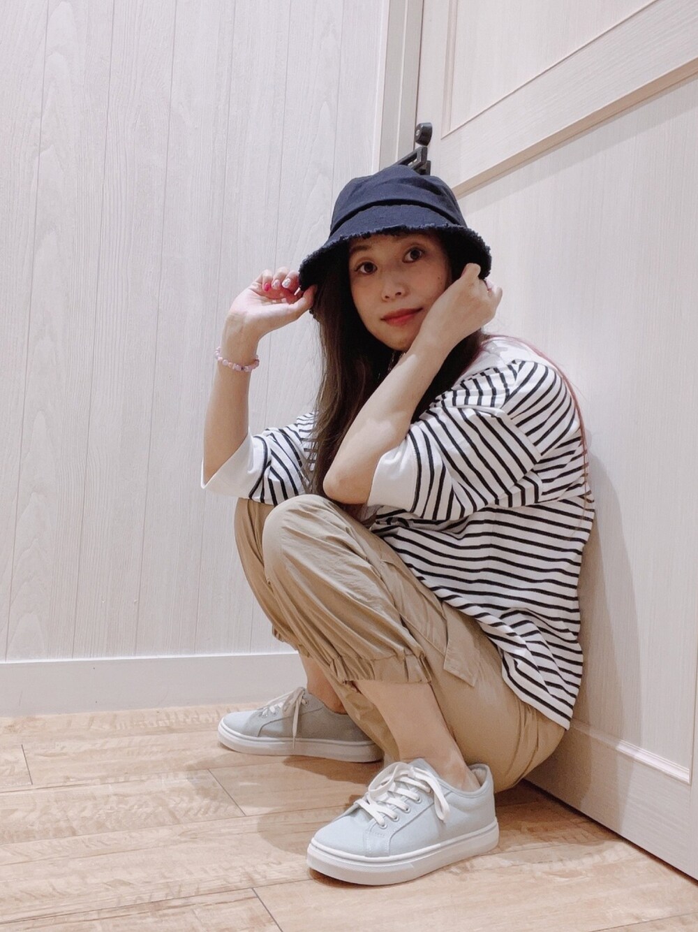 古着っぼ スタイル🎶 . 大きめ襟のトップスはシャカシャカパンツで合わせてカジュアルに着れば甘くなりすぎずGood👍✨ . かわいい大人カジュアルスタイルになります🤗