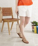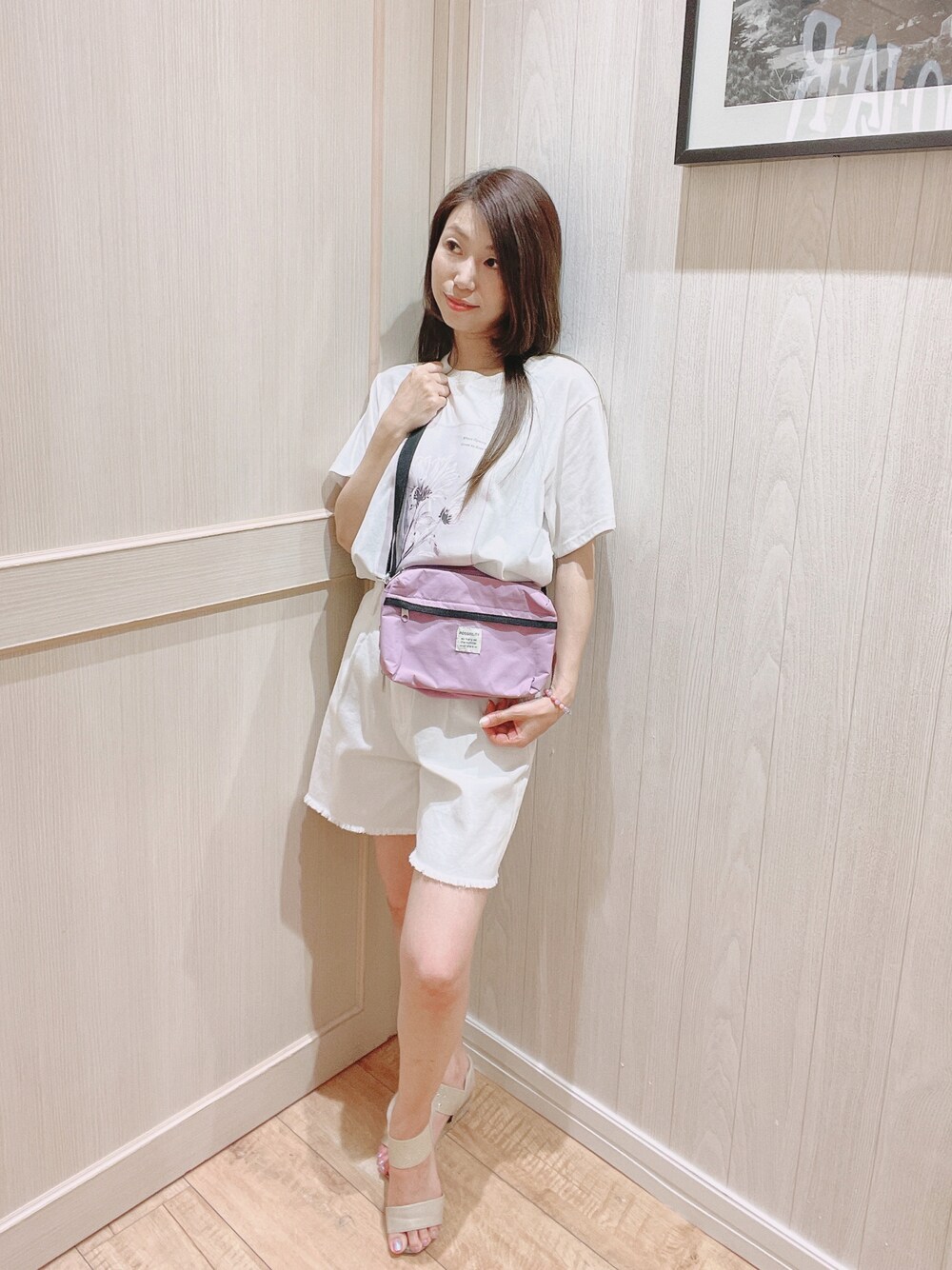 Tシャツ×ショートパンツ の真っ白コーデでさわやかに☆ パープルのバッグがアクセント!! 今年も大人気のシューダルは疲れを知らないサンダル!毎日履けちゃう!!