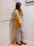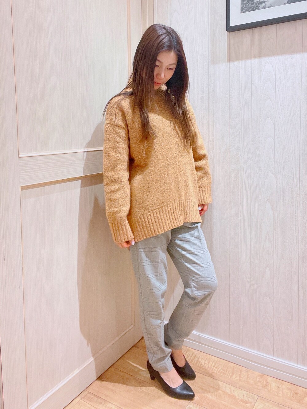着るだけでポイントになるイエローベースカラーのニット! パンツはチェックパンツと合わせてキレイめカジュアルに。 パンプスをスニーカーに変えて元気スタイルにもなるよ!!