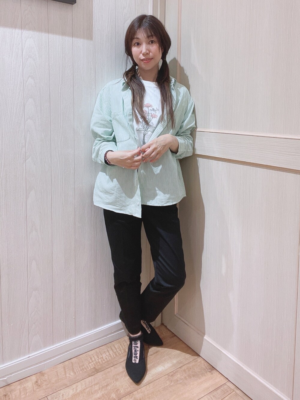 今季のマストカラーのグリーンを使用したシャツは着回し抜群!! 1枚あると便利☆ Tシャツは1,290円でお財布に優しく、 ゆるTなので体型カバーもできて嬉しい!!