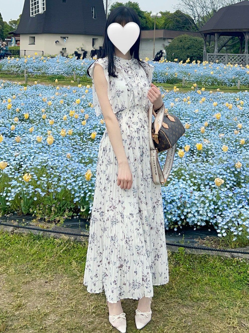 𝒎𝒂𝒑𝒍𝒆🤍めーぷるのワンピース「【WEB限定サイズあり】Sustainableフリルプリントワンピース」を使ったコーディネート
