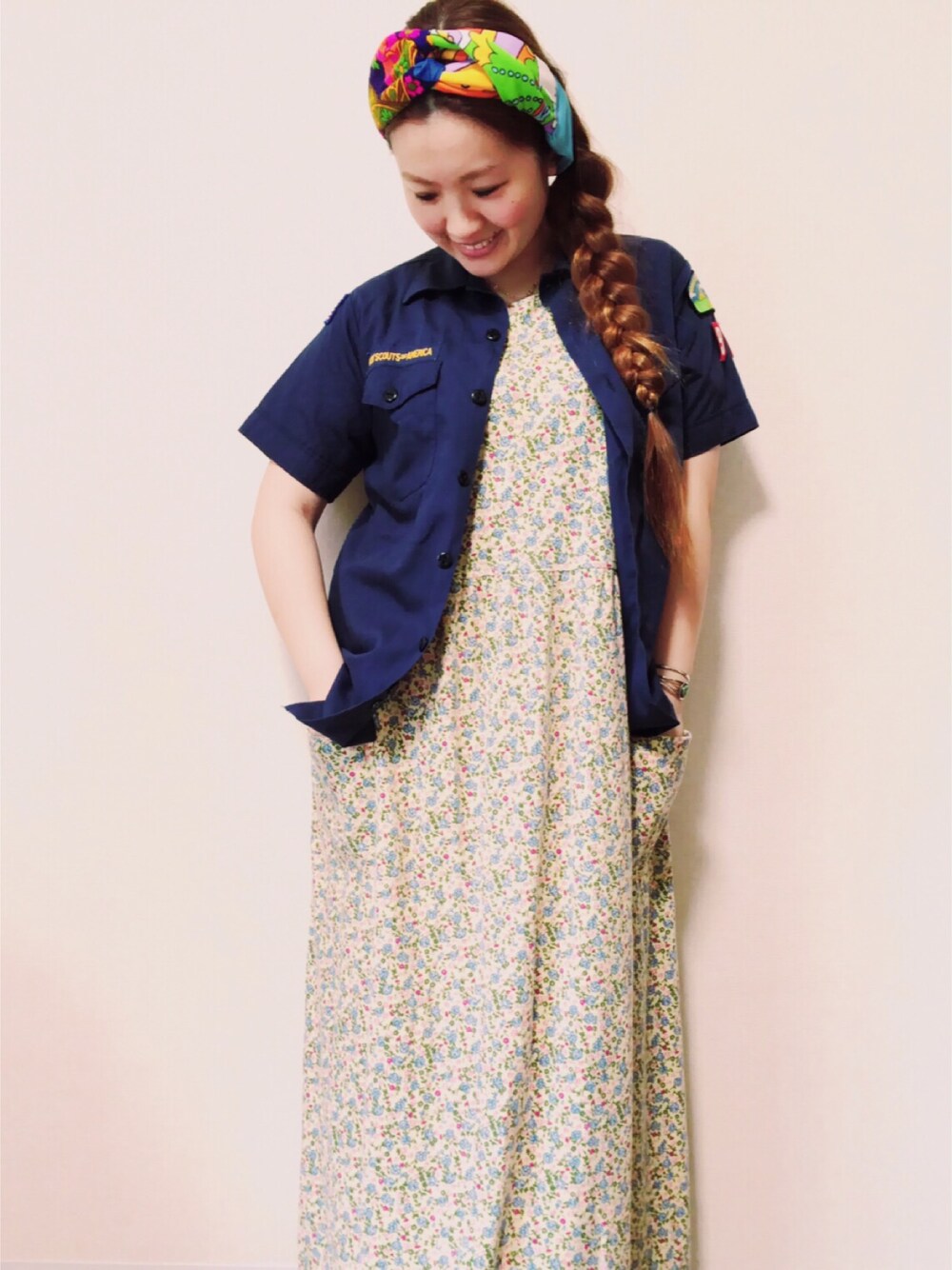 アウター💜古着ボーイスカウトシャツ ワンピ💜古着カット半袖マキシワンピ ヘアターバン💜maplesugar古着リメイクねじりヘアターバン http://walnuts.base.ec にて発売中💓