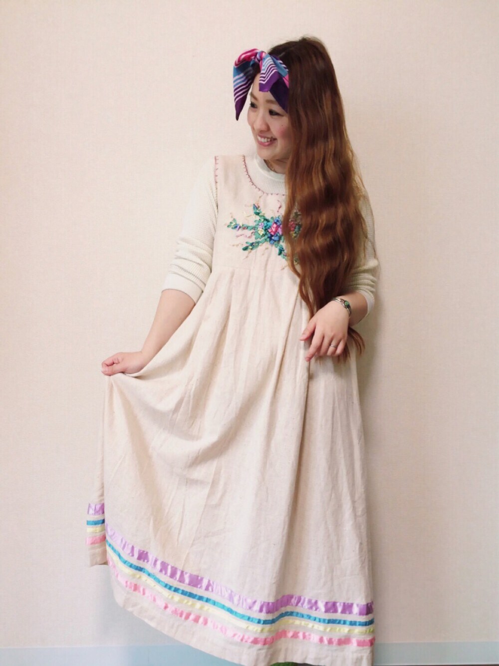 ワンピ💜古着りぼんお花ワンピ インナー💜古着クロスステッチ刺繍サーマルカットソー ヘアターバン💜ヴィンテージスカーフ http://walnuts.base.ec にて発売中💓