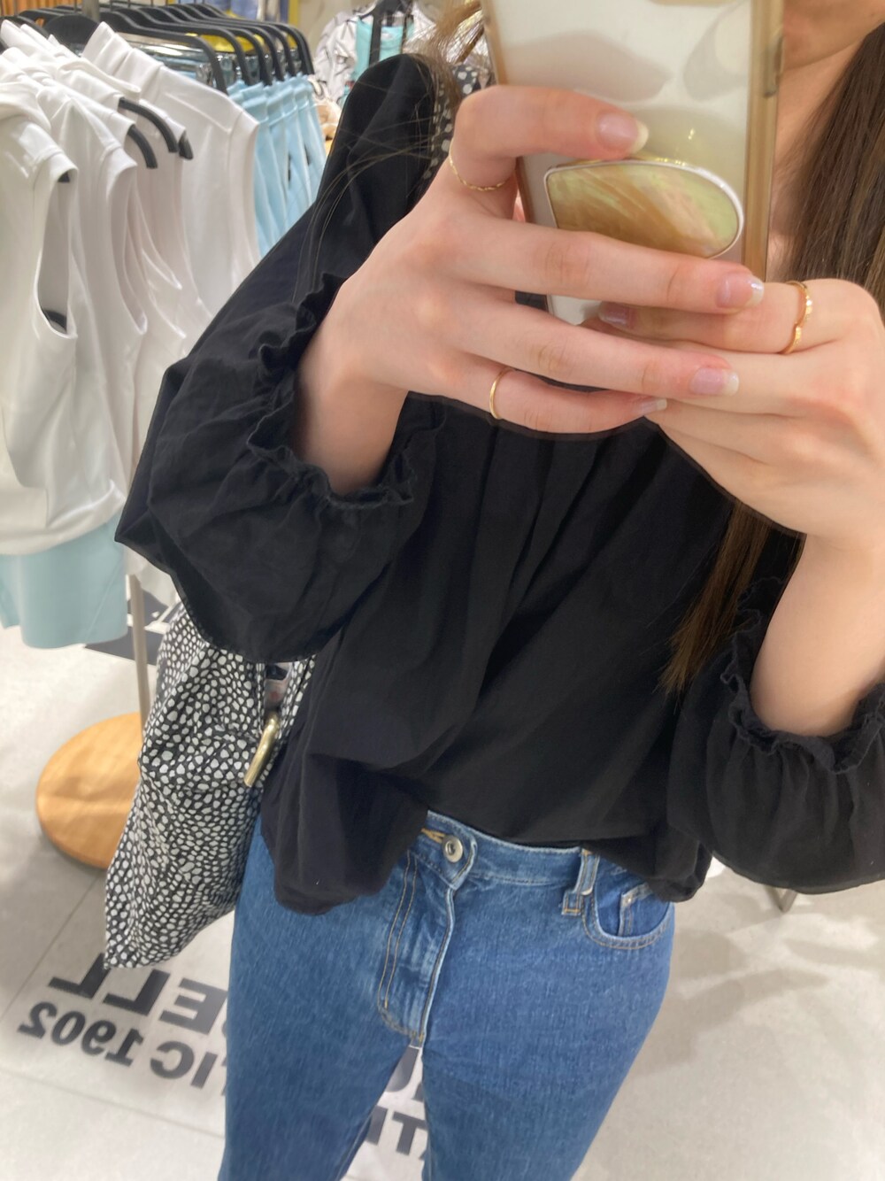 ブラック系のシャツ/ブラウスを着用したレディースの春コーディネートの1枚目の写真