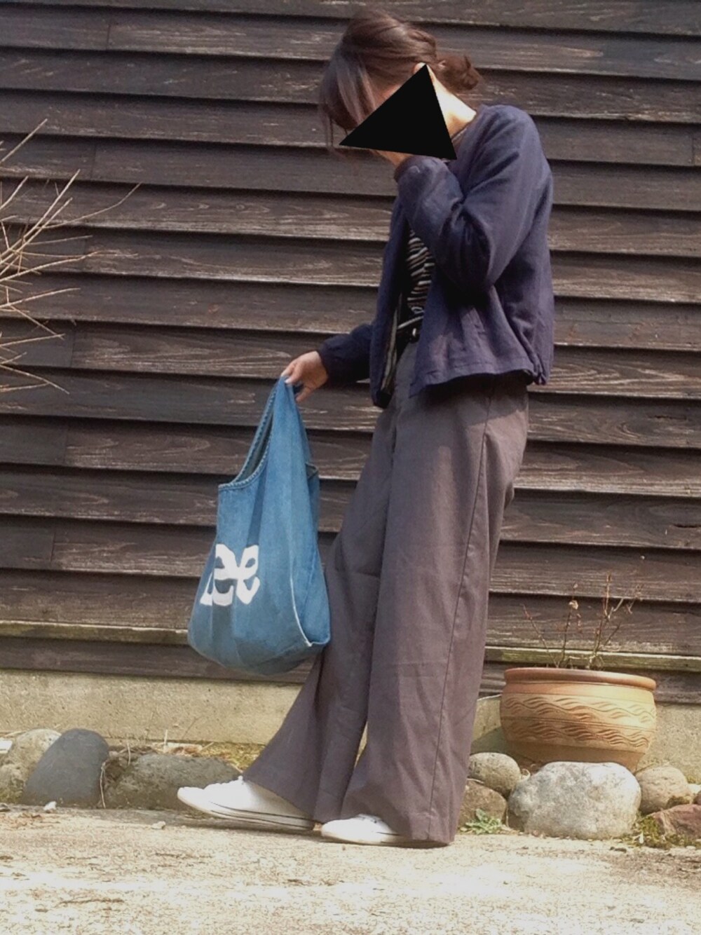 服が暗めのイロばかりですが、 白スニーカーとデニム生地のバッグで 少しでもハルらしくしてみています