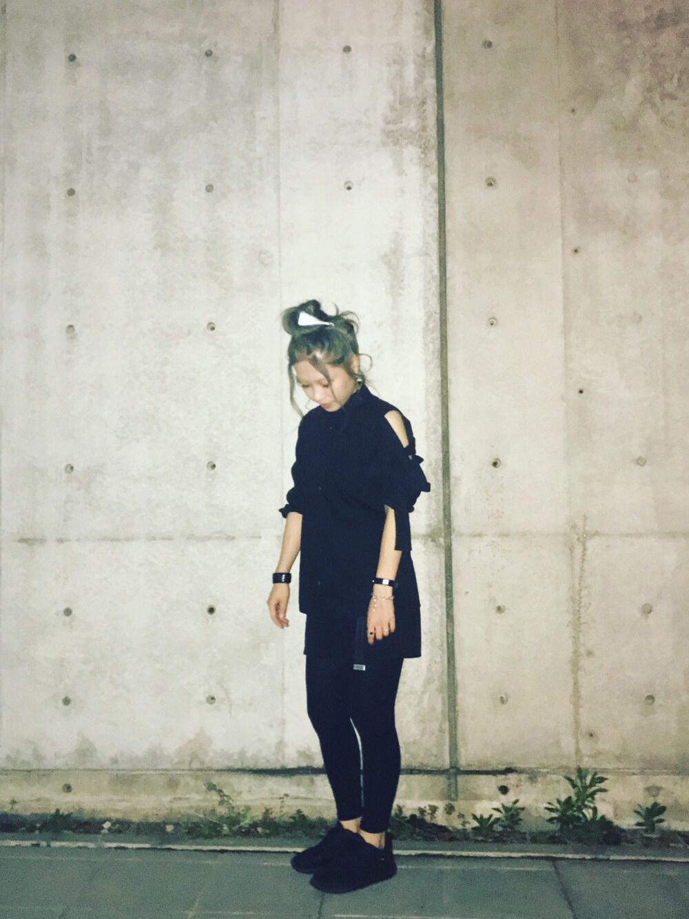ブラック系のシャツ/ブラウスを着用したレディースの夏コーディネートの1枚目の写真