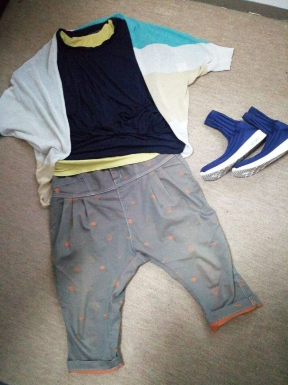 個性的なサルエルパンツはプリントじゃなくて刺繍 折返してチラッと見える裏地のオレンジが可愛くてお気に入り