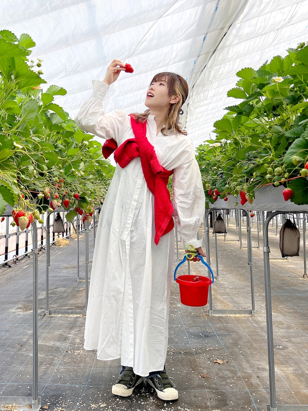 🍓いちごコーデ🍓 白シャツワンピはウエストにデザインがあって着回ししやすくてお気に入りです🎶