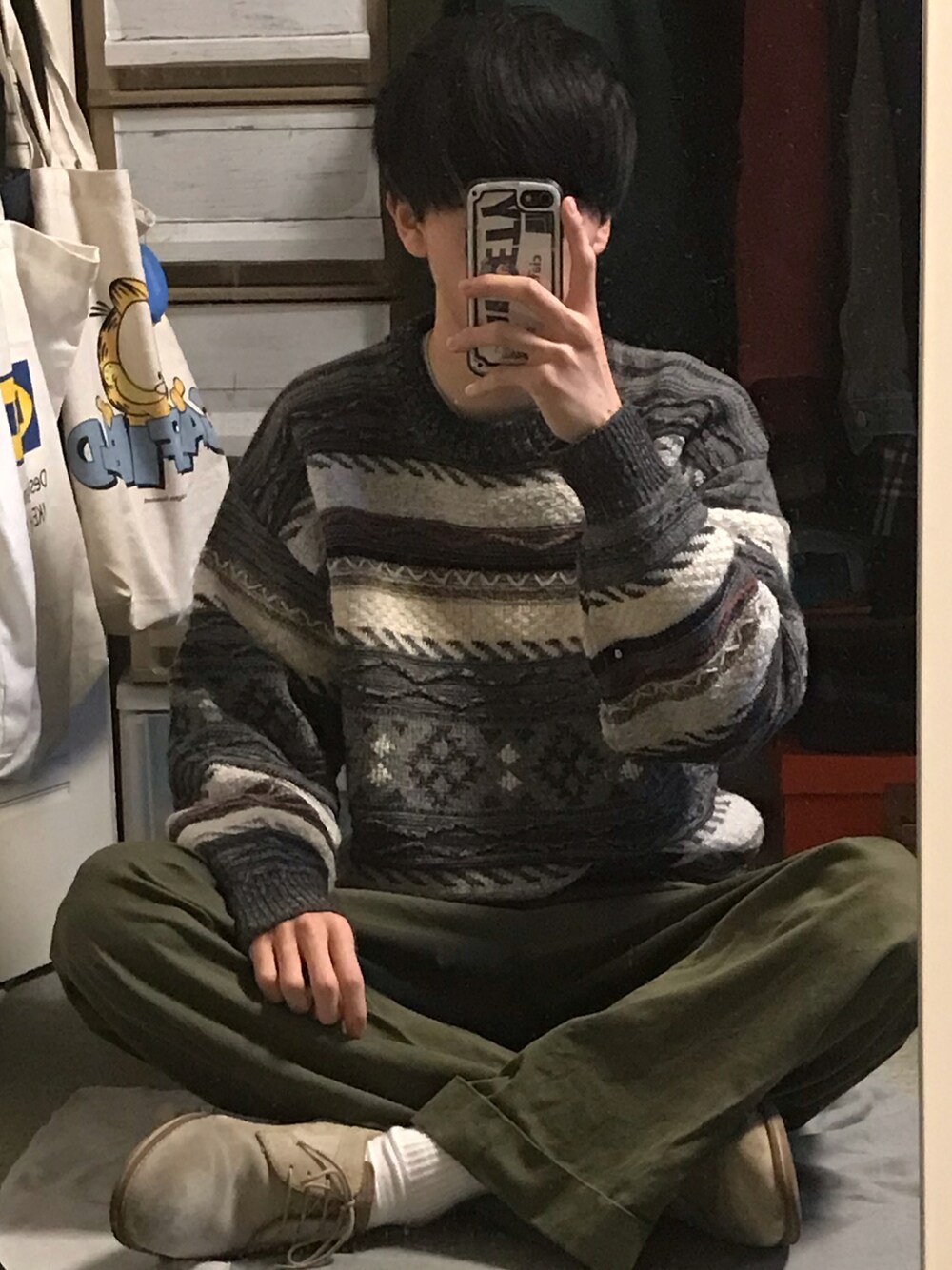 閲覧ありがとうございます。m(*_ _)m いいね、フォロー、コメント、お気にいり追加も嬉しいです🙇♂️ 3Dニットで古着コーデです✨ 古着屋でお気に入りの柄の3Dニット探すの楽しいですよ🤞