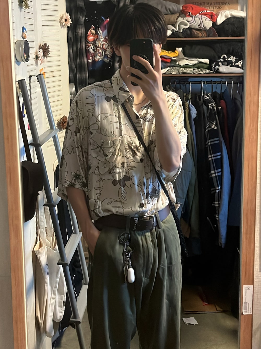 ベージュ系のシャツ/ブラウス、グリーン系のパンツを着用したメンズの夏コーディネートの1枚目の写真