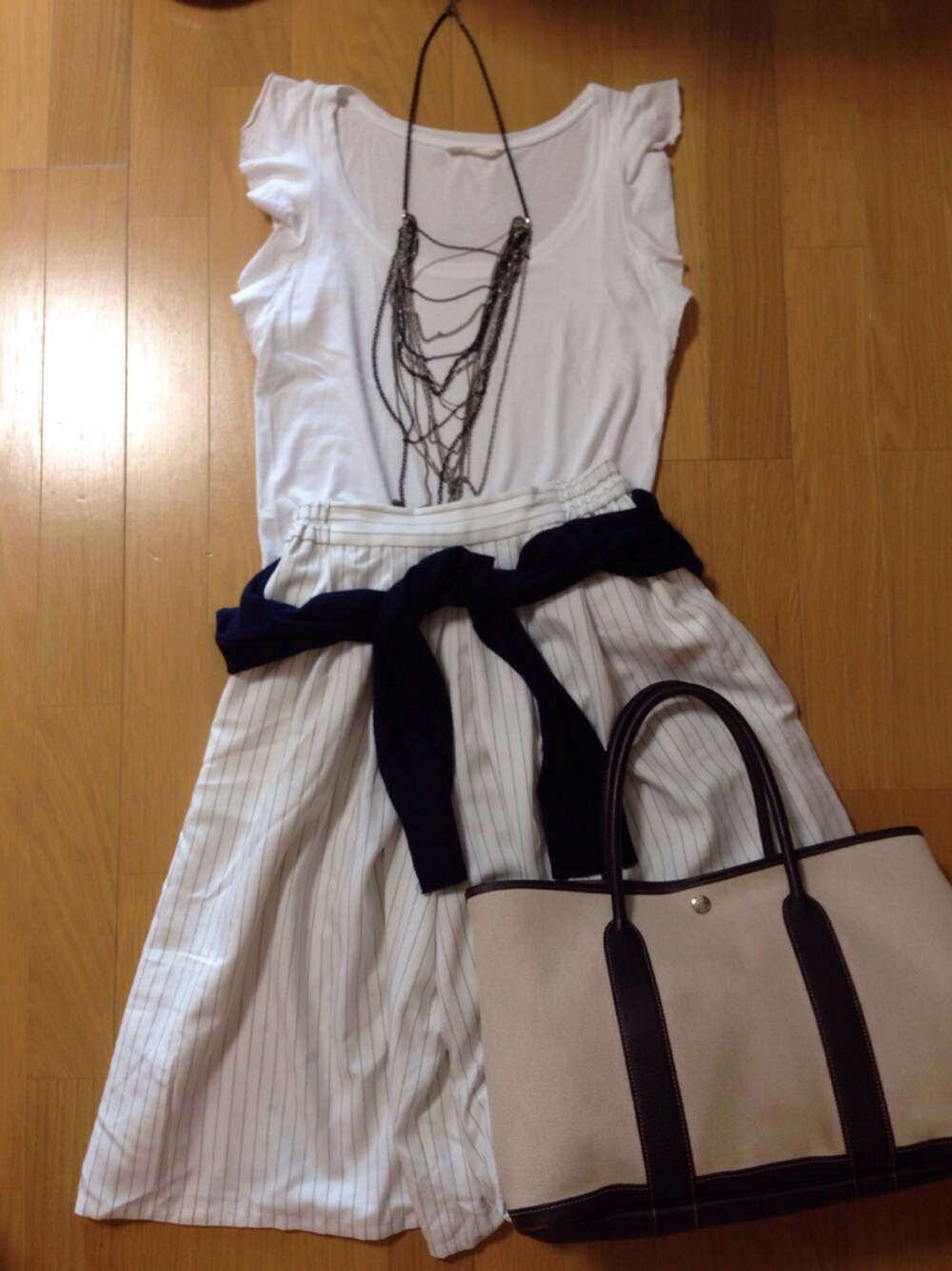 ホワイトコーデ♡ 差し色にネイビーのカーディガンを腰に巻きました(*ノv`)b