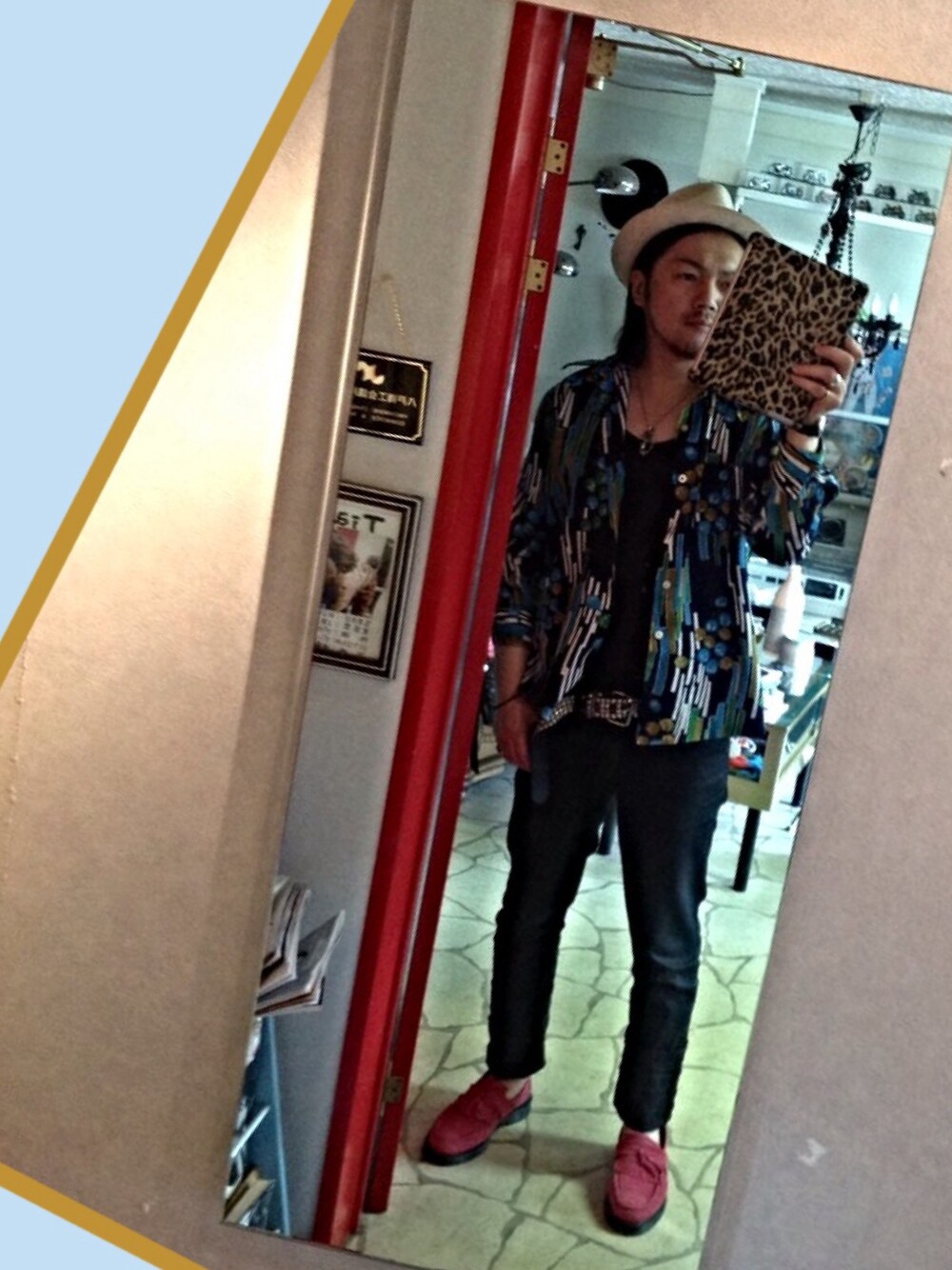 15年前にアメリカ古着で買った、幾何学模様の派手目なポリシャツに合わせた、ネオチンピラ風ROCKコーデ★ 白のパンツに合わせた方がもっと粋で良いのですが持っていないので今年の夏は購入しますww このてのシャツはおもいっきり意気がって着こなすのがポイントですね!(=^ェ^=)