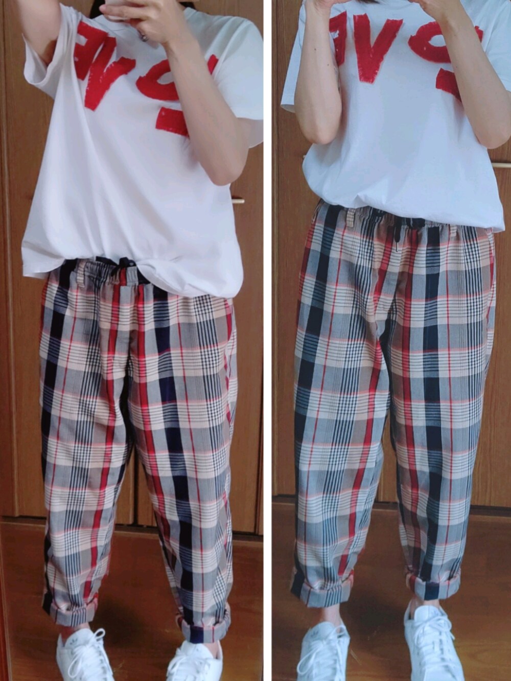 チェックパンツ登場!!実はメンズ。柄が大きめで迷ったけど赤が気に入ってTシャツの赤と合わせてみた。丈長めではいてもいいし、ロールアップまたは七分丈までクシュクシュアップしてもいいかな…とか妄想。