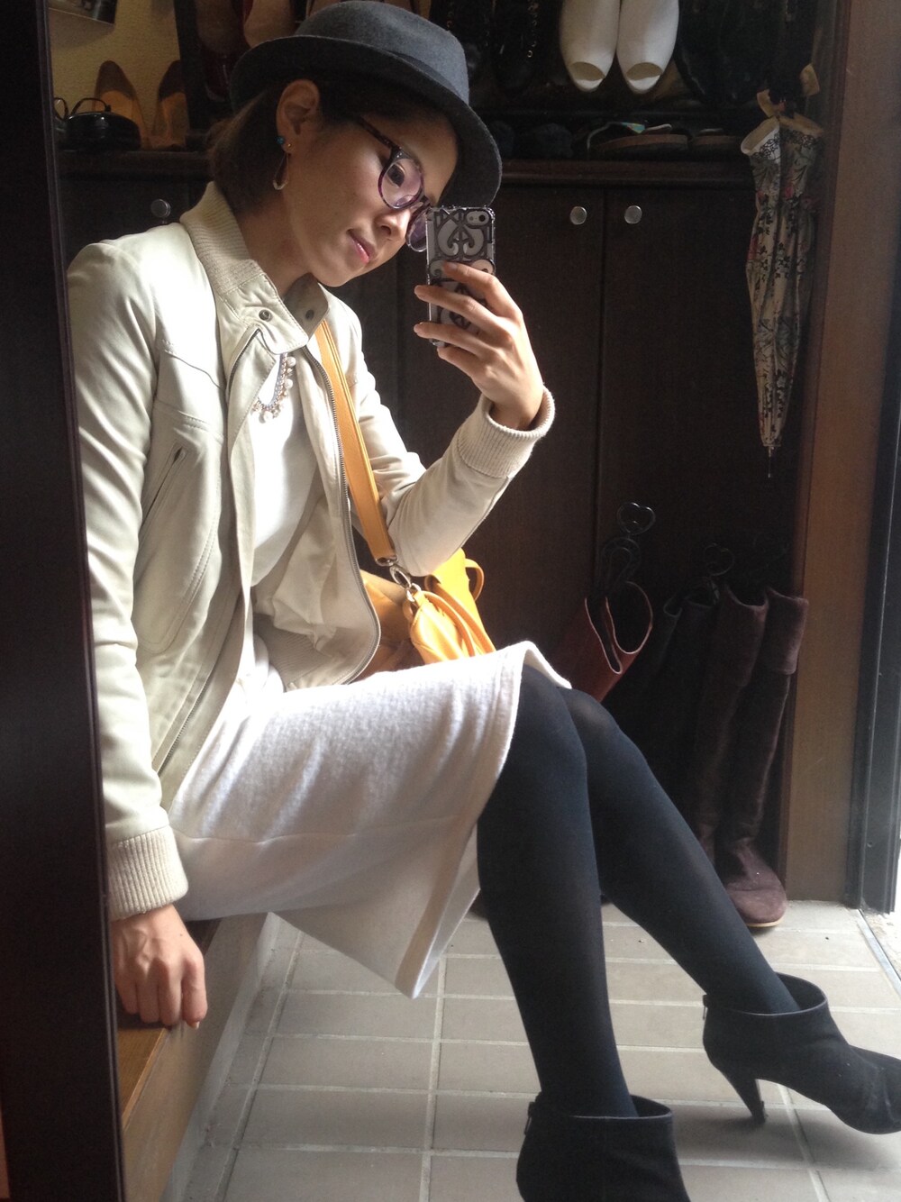 今日はカフェでお仕事するのだ! 雨のはずが天気よいですねぇσ(^_^;) 大きな黄色いトートバッグにパソコンと本を詰めて下北沢のお気に入りカフェへ。 今日は何だか気分的にホワイトコーデにしてみました。 白のフェルト地のスカートに 同じく白のスウェットカットソー。 アウターも薄いベージュのライダースブルゾン。 これはラム生地で柔らかくて使い易いのです♡ グレーのフェルト地ハットと べっ甲のメガネでちょいと外して…。 息抜きに投稿!仕事するーー( ̄▽ ̄) あ、最近はOnitsuka Tigerのスニーカーが欲しくて狙ってます。