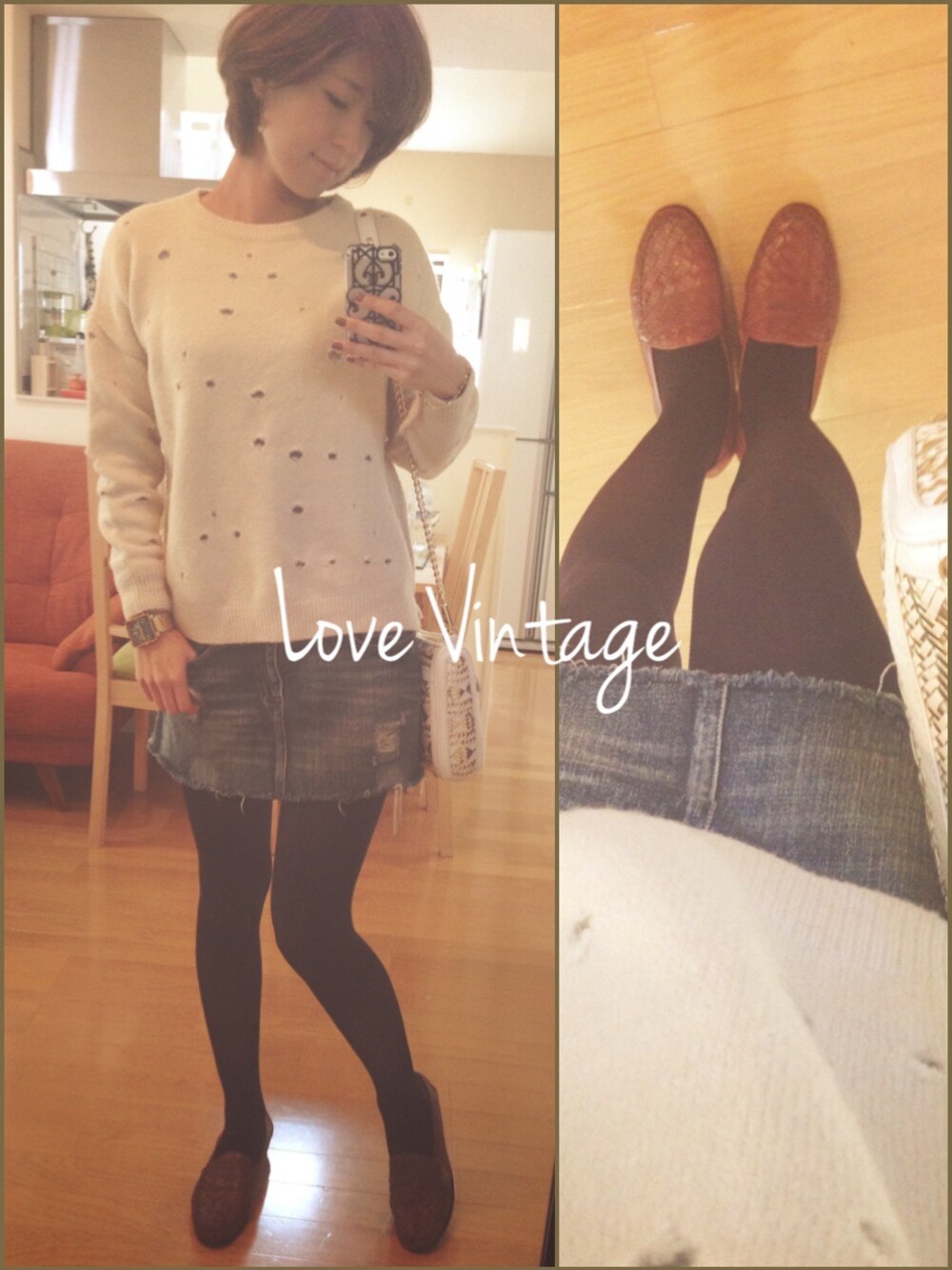 金曜だっ!あっという間ーー(>_<) 今日も打ち合わせとブレストたんまりやって、 夜は友達とお寿司食べに行きます♡ 今日もヴィンテージ(*^^*) コールハーンの可愛いローファーを発見してしまったので思わず購入! ヴィンテージなのに8,000円ぐらいでお手頃価格。 さすが下北沢🎶 もひとつ前にも着た穴あきのホワイトニット。 これやはり可愛いー。 数年ぶりに引っ張り出したデニムのミニスカートでバランスを整えて…♡ いつ買ったんだっけと思うぐらい10年ぐらい履いてる気がする…汗 色味はシンプルだけど少しパンチが欲しかったので ホワイト&ゴールドのクラッチショルダーを。 このレベッカミンコフのバッグはECのセールで20,000円ぐらいだったかな。 惚れて買ったもののちょっと派手で中身もそんなに入らないのぇ使うタイミングが限られる…笑 いいアイディアふってきますように…( ̄^ ̄)ゞ