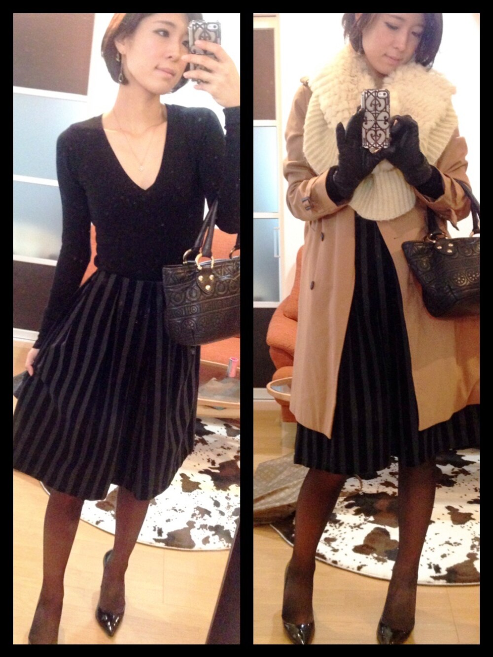今週も始まりましたねー。いきなりの雨が寒すぎるヽ(;▽;)ノ 今日は飲み会があるので大人っぽいのにしてみました。 週末買ったベロア素材の縦ストライプのスカート。 硬めの生地なので広がり具合がすごく素敵です♬ それに、シンプルなVネックの黒ニットと黒パンプスと黒バッグ… 黒すぎ!ということでベージュのスヌードで少しでも顔まわりを明るくー♬ アウターもベーシックにトレンチです。 皮のブルゾンでもよかったかもー! と、今ふと思いましたσ(^_^;) バッグと手袋はANNA SUI。 小物でANNA SUIは意外と好きかも。 夏に買った日傘もANNA SUIでした。 17デニールのタイツだけだと足がやっぱり冷えますな、、。 なんか仕事の集中力がない。。 うーんうーん。