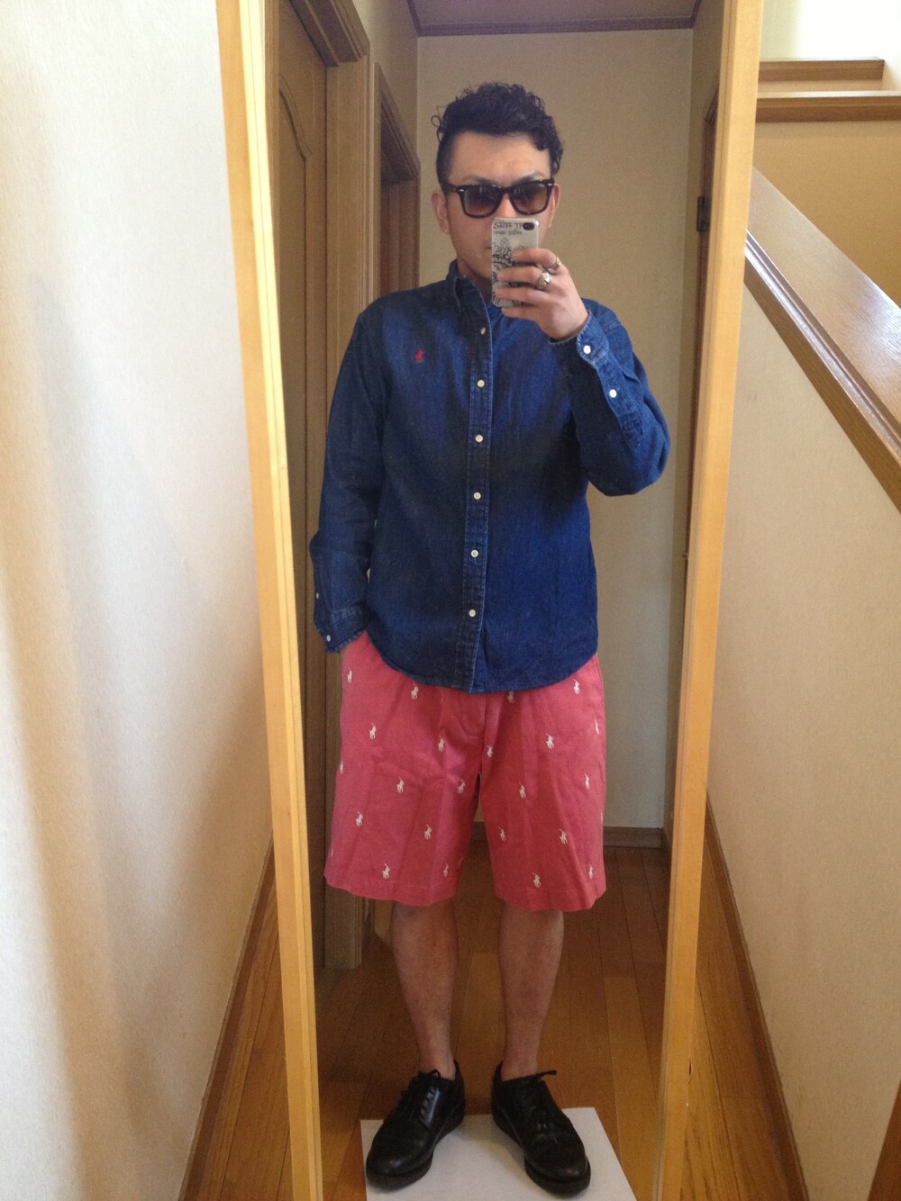 デニムシャツ/古着 ラルフ ショートパンツ/ラルフ シューズ/レッドウィング サングラス/レイバン 革靴STYLEその2 ラルフのデニムシャツを丈直しに出したらナイスサイズになりました( ´ ▽ ` )ノ
