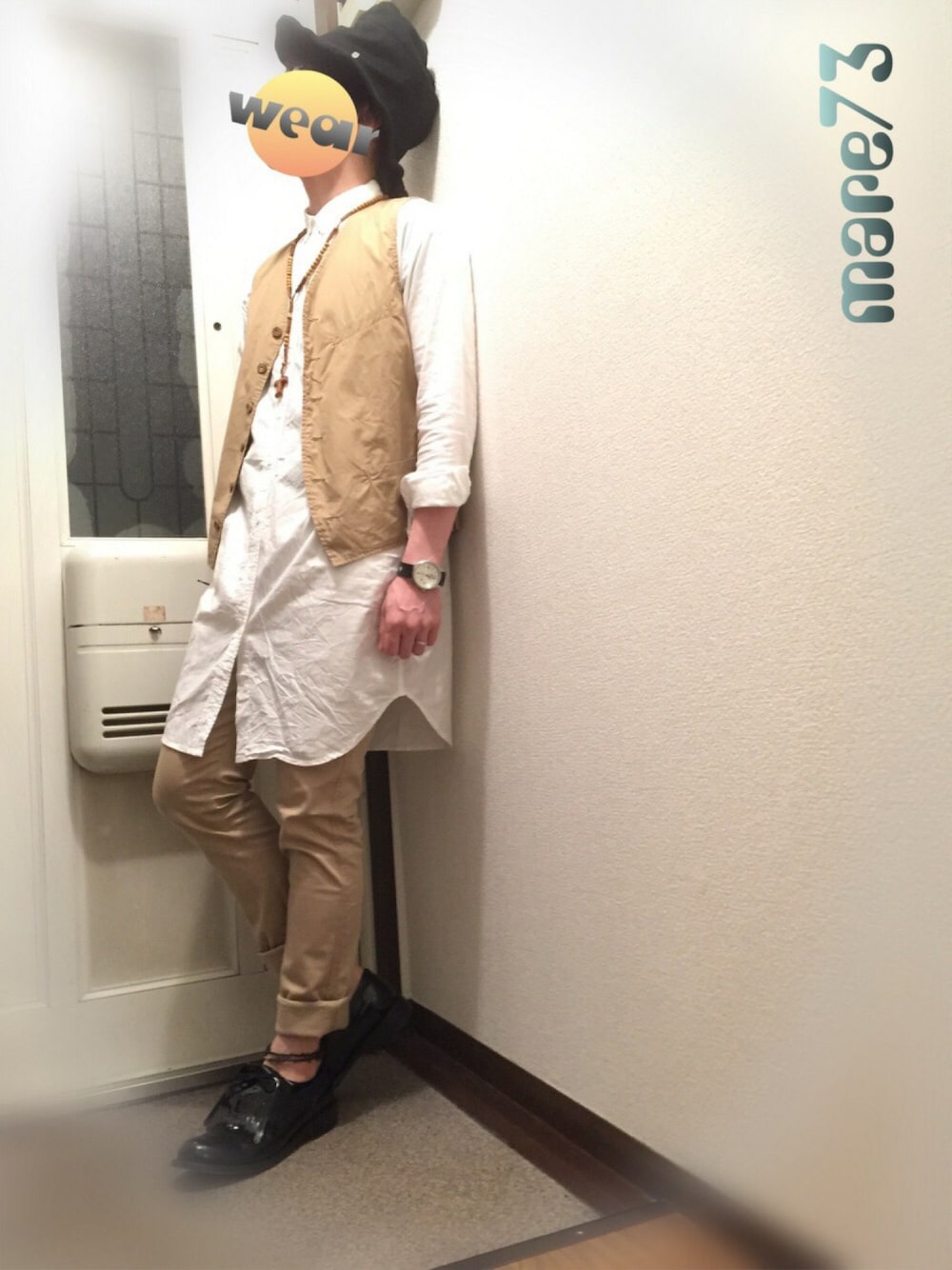 いつもいいね、save、コメント、フォロー...etcありがとうございます✨✨ 今回は白シャツ×チノパンの定番に少しアレンジを加えて🎵 シャツをロングに、ベストも重ねて少しゆるい感じにしてみました✨