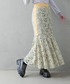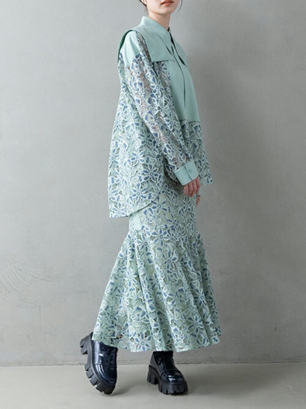 フラワー柄のコード入りレースを使用したブラウスとスカート。 ブラウスはビッグセーラーカラーになっているトレンド感のあるアイテム。 マーメイドラインのスカートは今シーズンも人気です。
