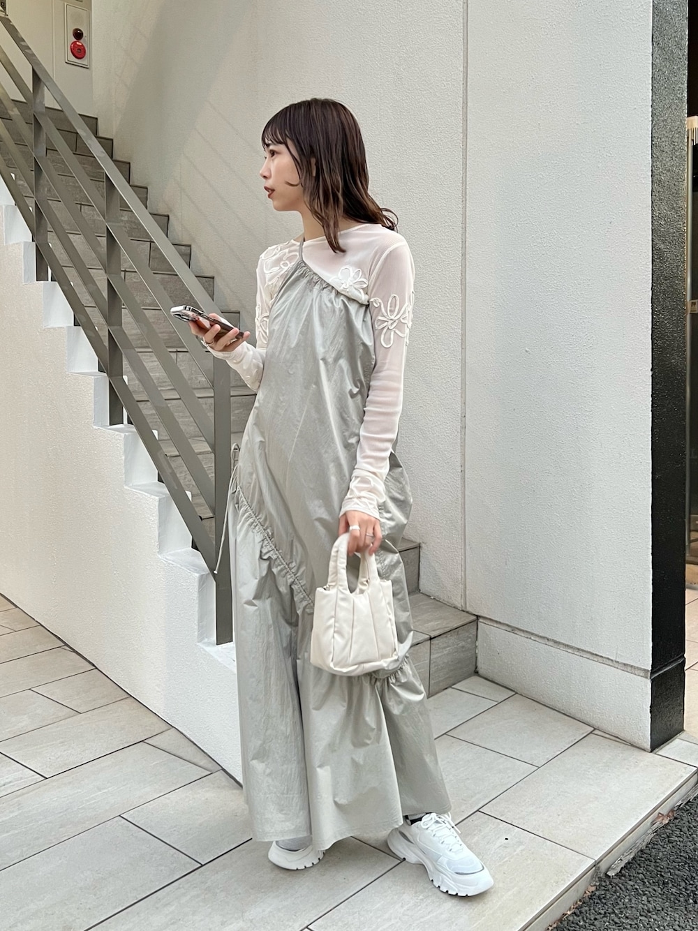 【スタッフレビュー】 骨格:ナチュラル パーソナルカラー:イエベ秋 【tops】 着用カラー:アイボリー 着用サイズ:フリー 落書きのような花柄が可愛いトップス。 シアートップスなので春まで長く使えます。 サロペットやワンピースに合わせたり ジャケットやカーデの中に着るのもおすすめ! 【one-piece】着用カラー:ミント 着用サイズ:1 光沢のある素材で1枚で存在感抜群のワンピース。 私の身長でサイズ1がぴったりでした。 透け感はないので、下着が透ける心配はありません。 ワンショルダーにしていますが、キャミワンピとしても着用可能! 【bag】着用カラー:アイボリー ふにふにとしたデザインがかわいいミニバッグ。 小さめお財布と小さめポーチぐらいしか入りませんが コーディネートのアクセントになります。